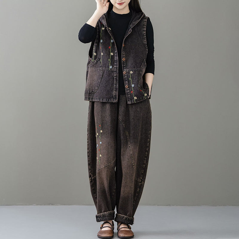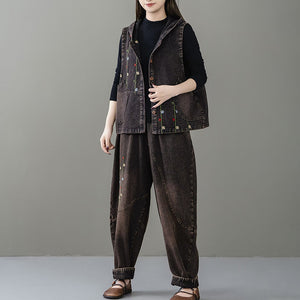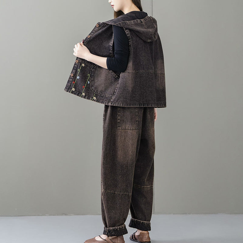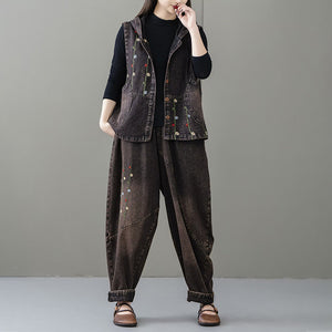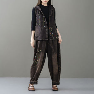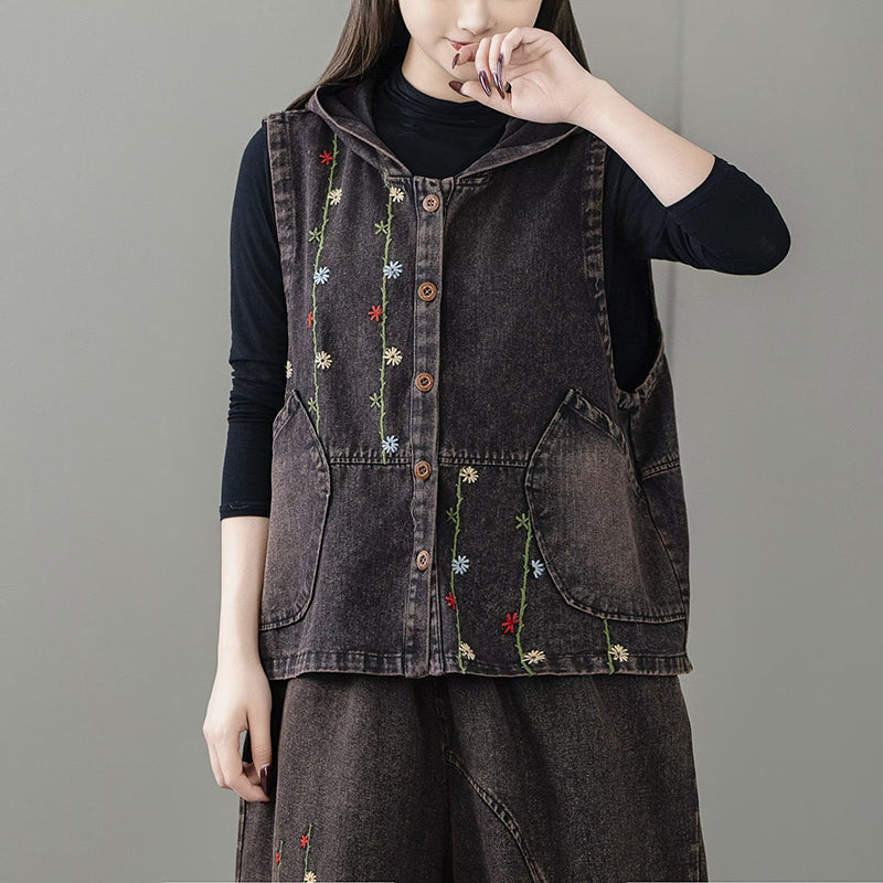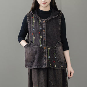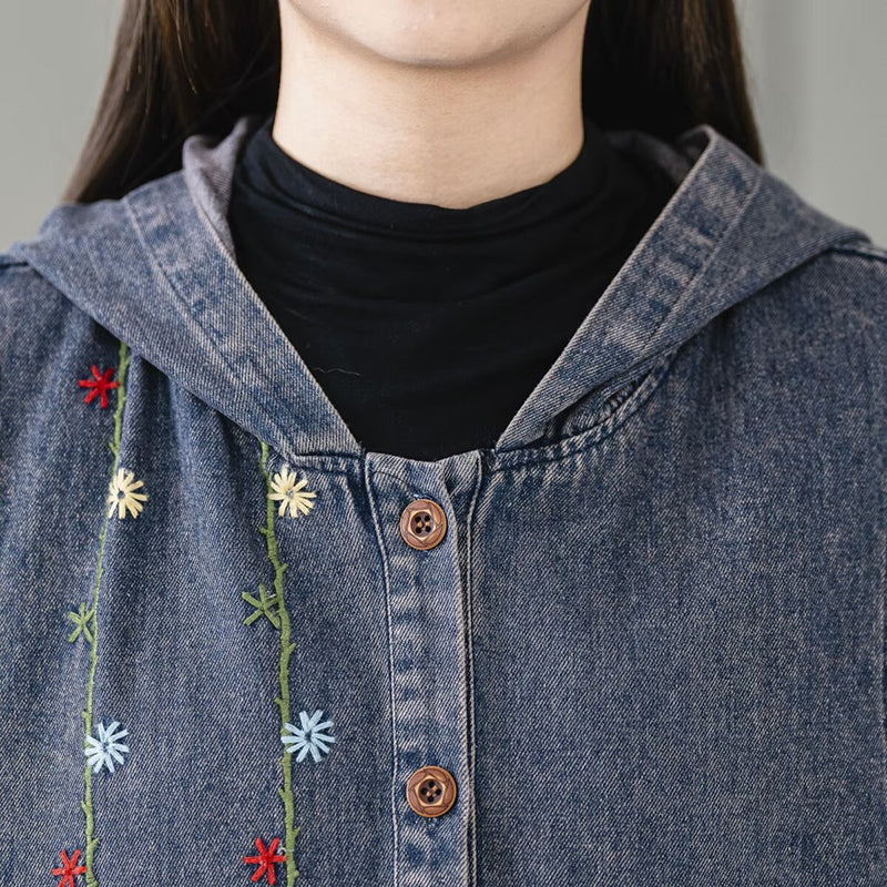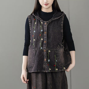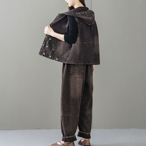 Áo khoác denim gile sát nách có mũ thêu dây hoa - A062