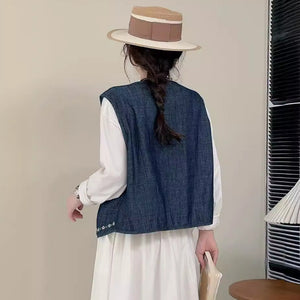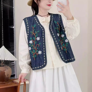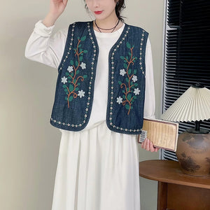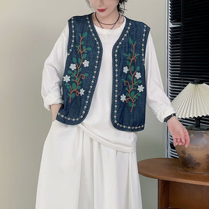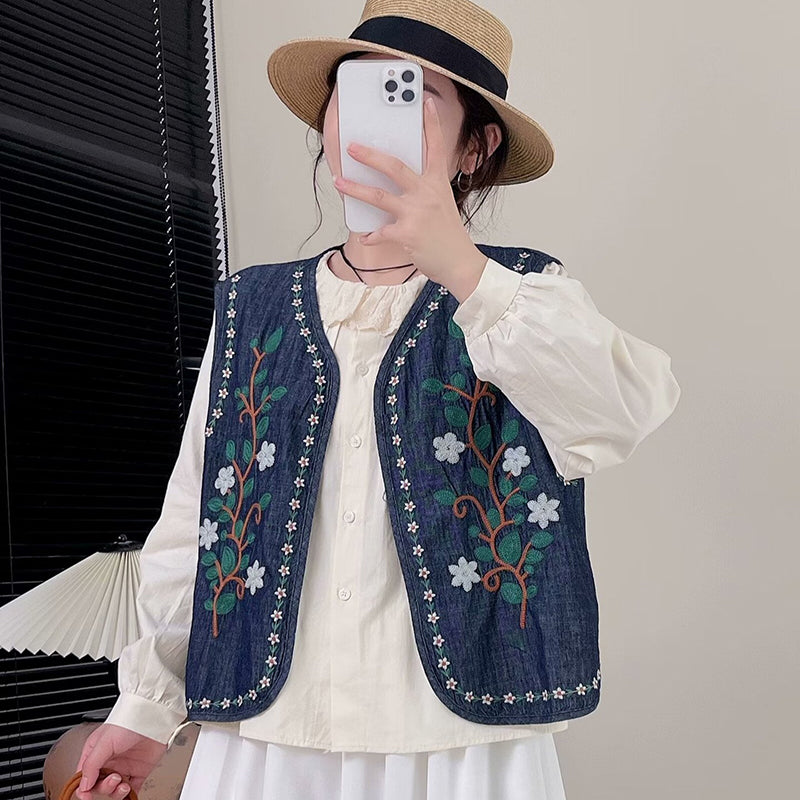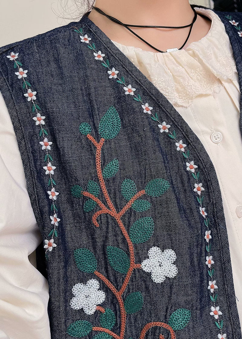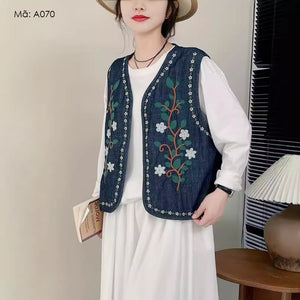 Áo khoác gile denim sát nách cổ V thêu hoa lá đối xứng - A070