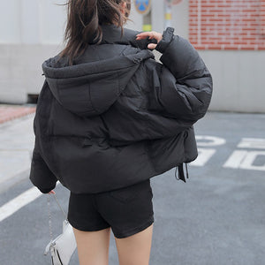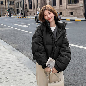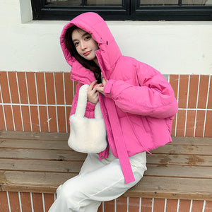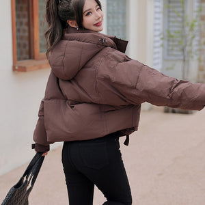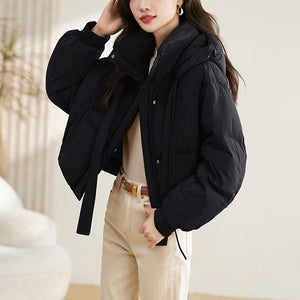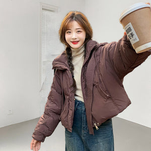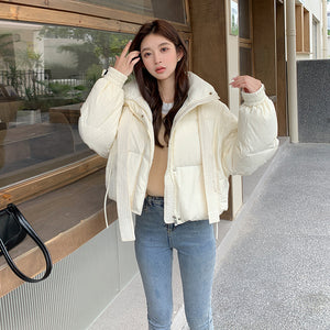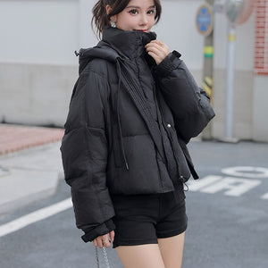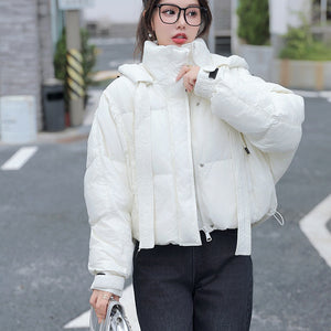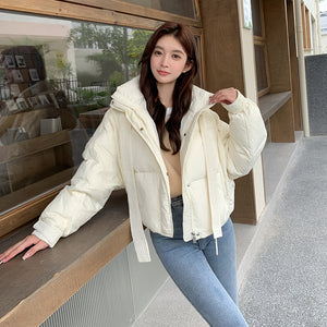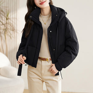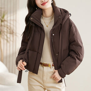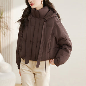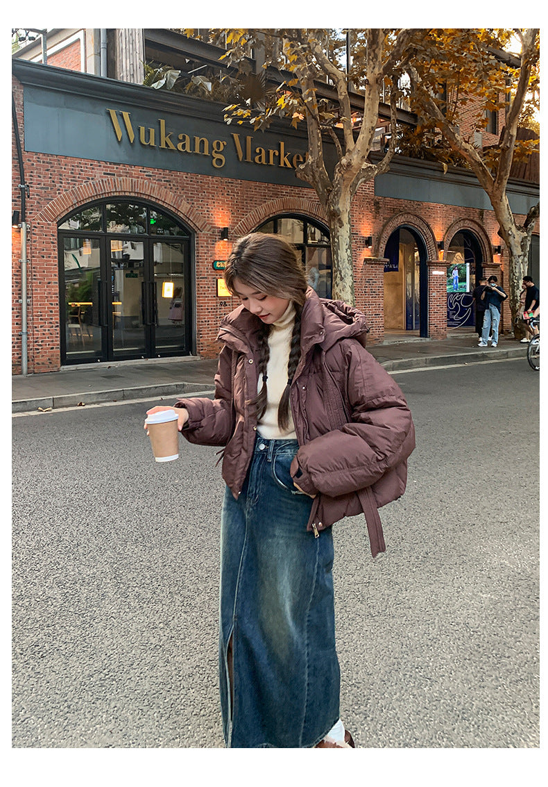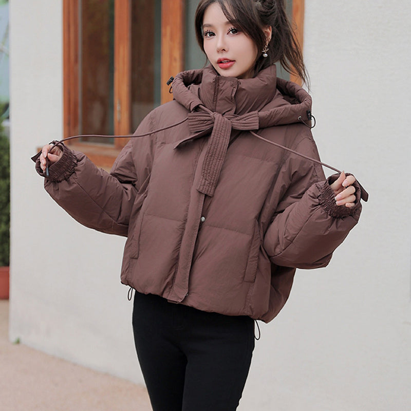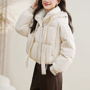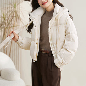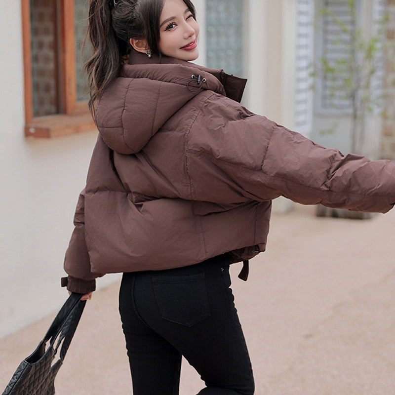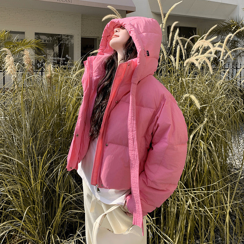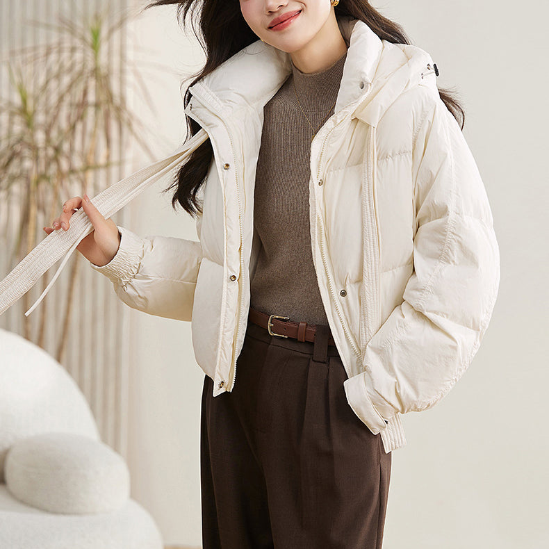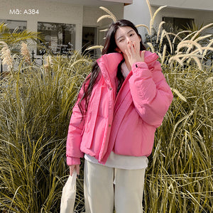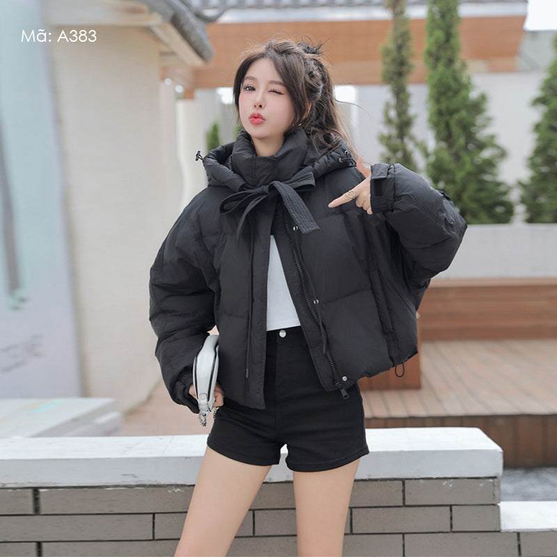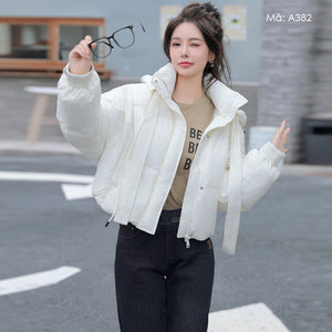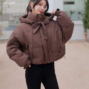 Áo khoác lông vũ dài tay cổ đứng có mũ dây lớn - A382