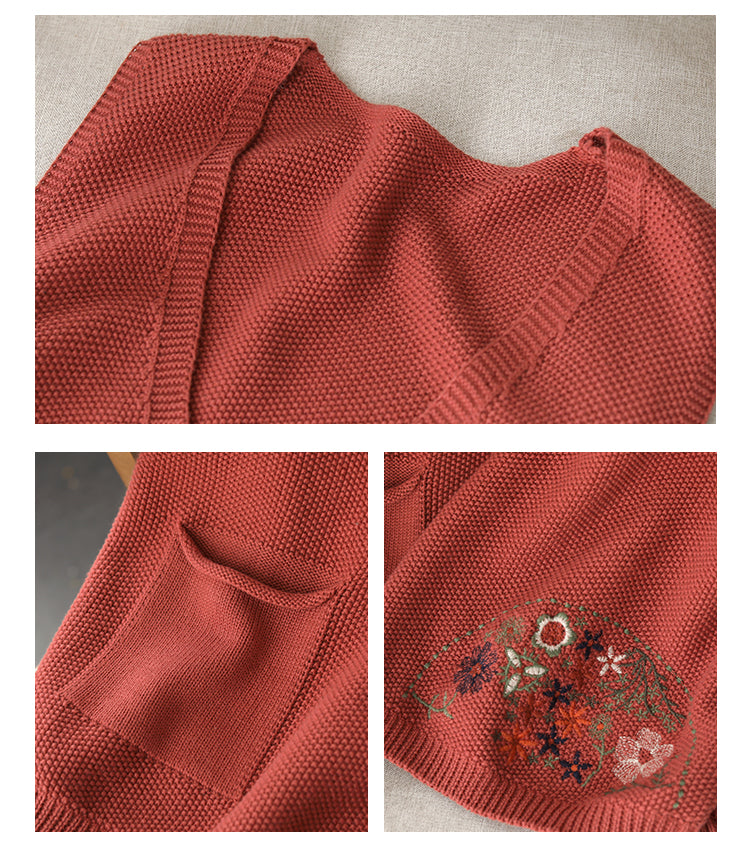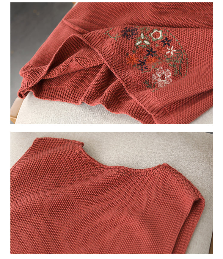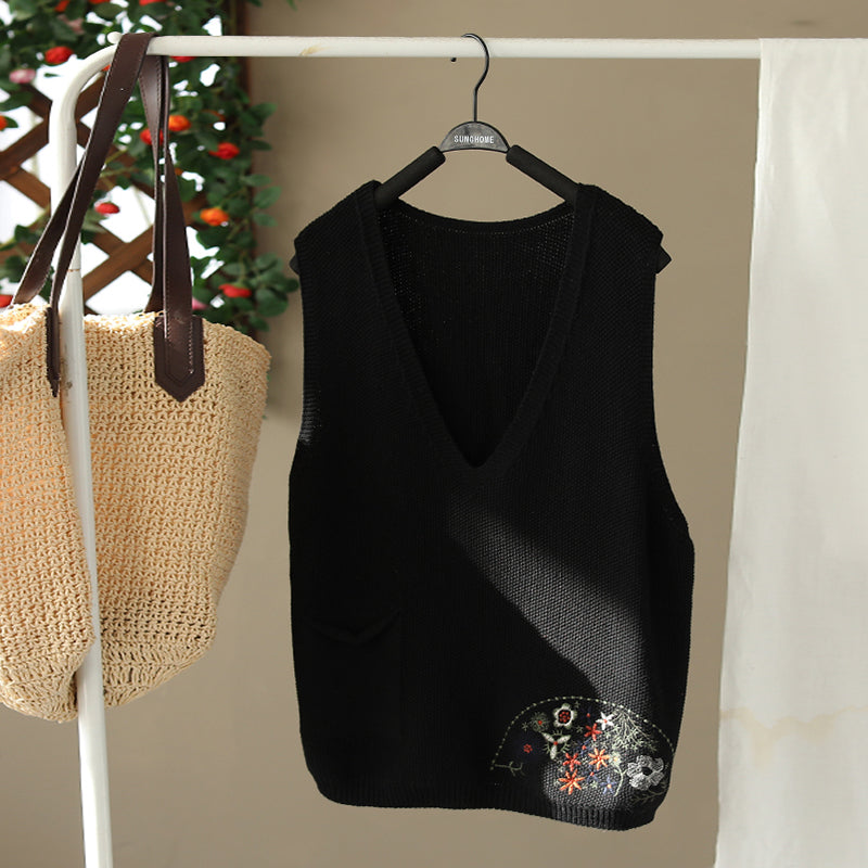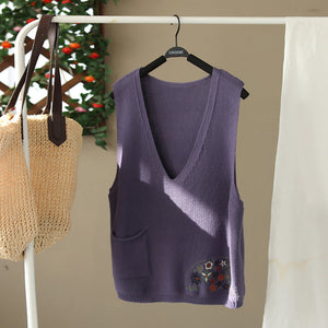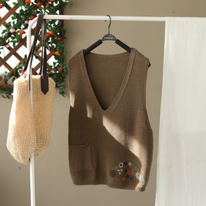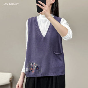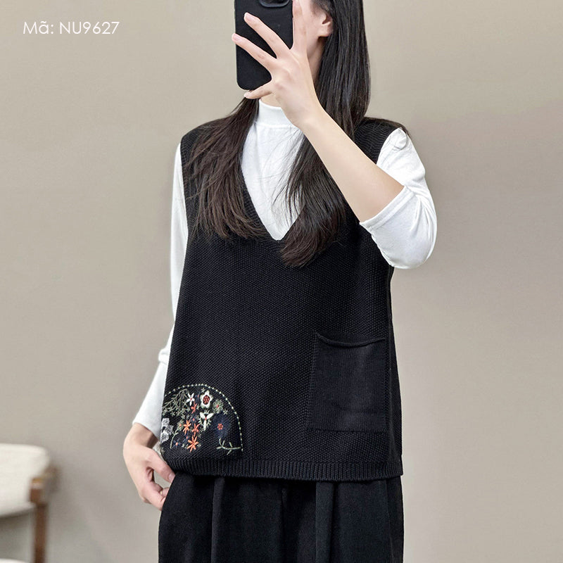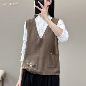 Áo len gile sát nách cổ V thêu hoa lá một túi - NU9627