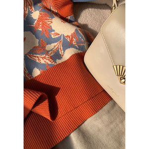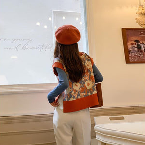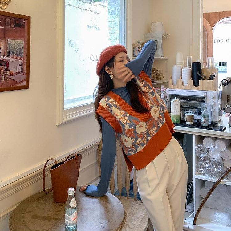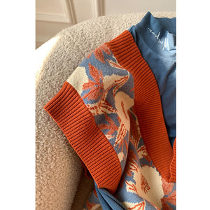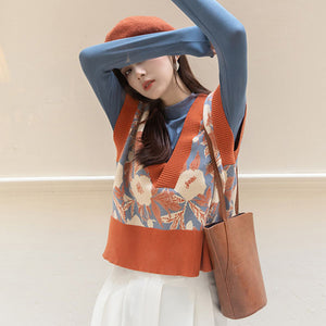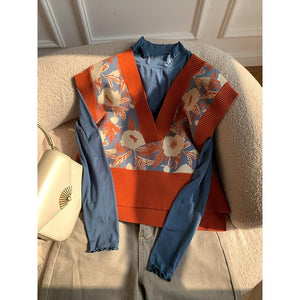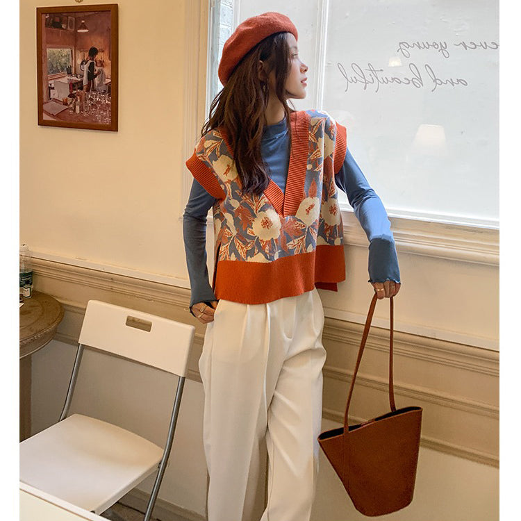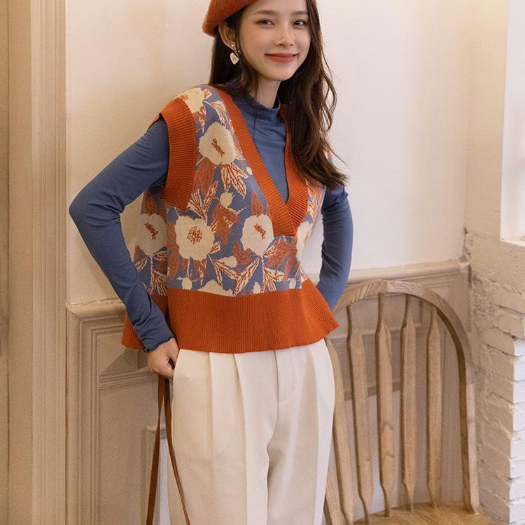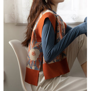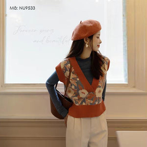 Áo len gile sát nách cổ V xẻ tà in hoa lá - NU9533