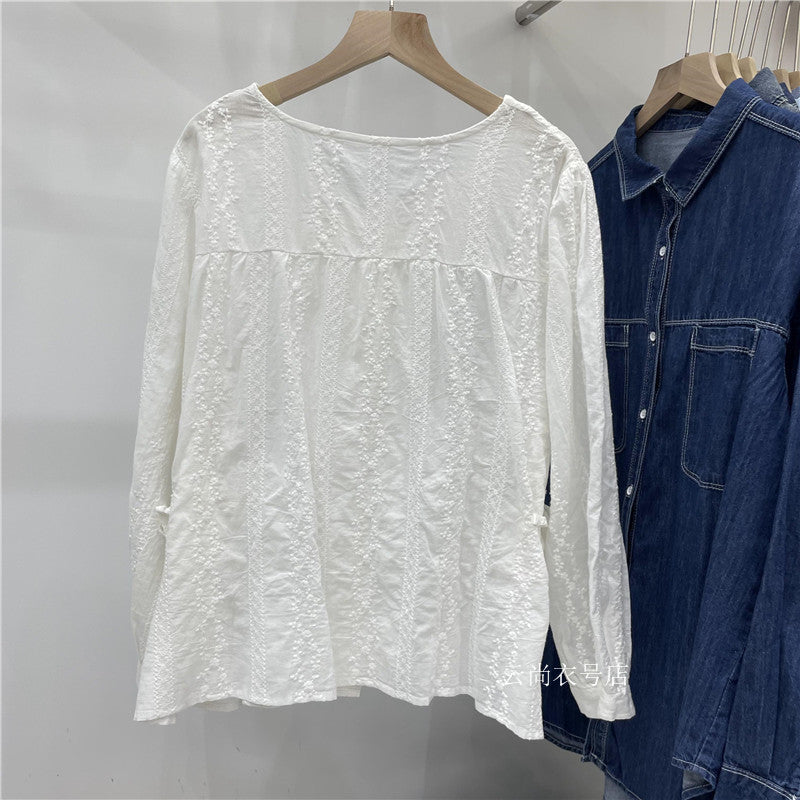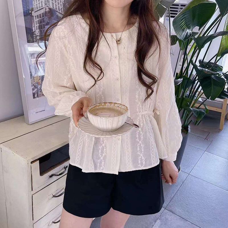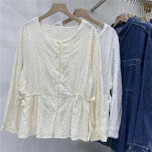 Áo sơ mi dài tay cổ tròn thêu hoa lá eo thắt nơ - NU8231