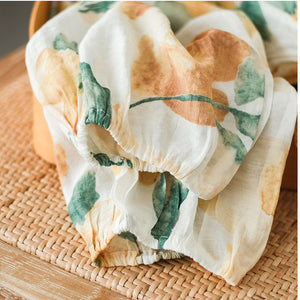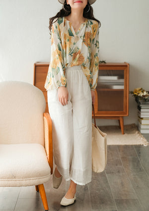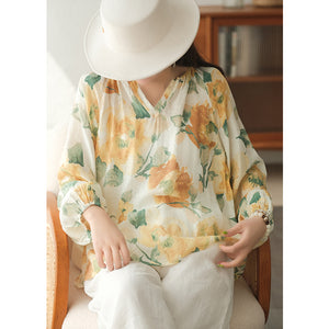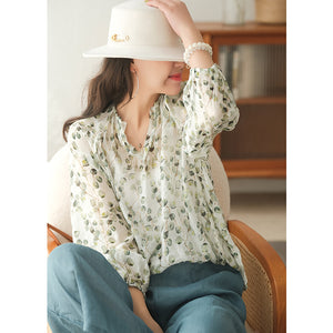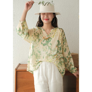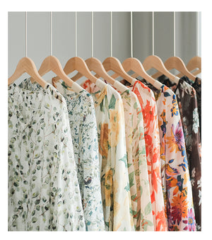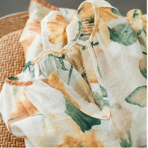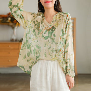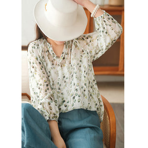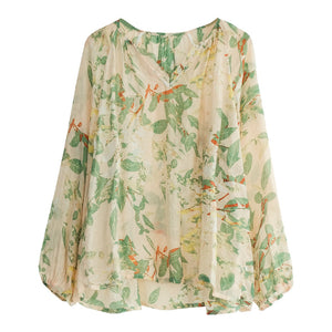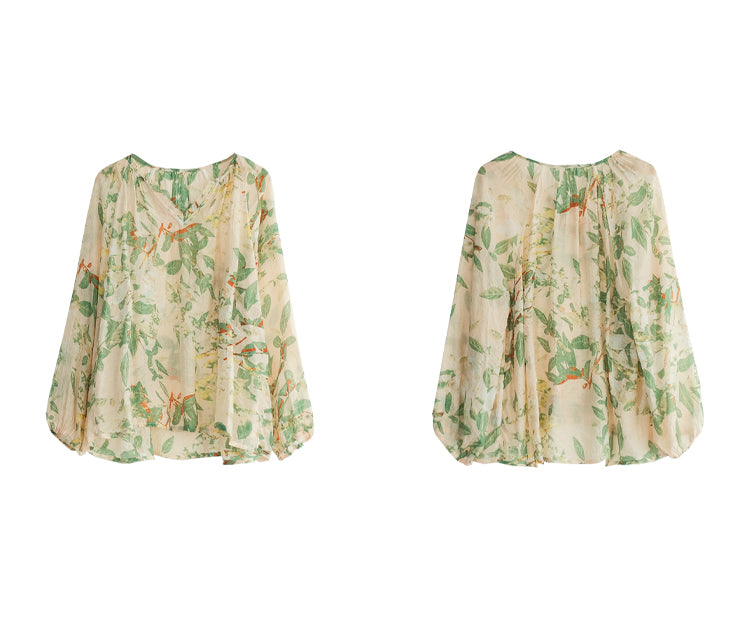 Áo sơ mi dài tay cổ V in hoa lá tay bồng- NU7270
