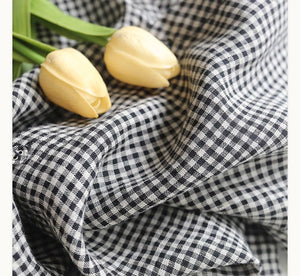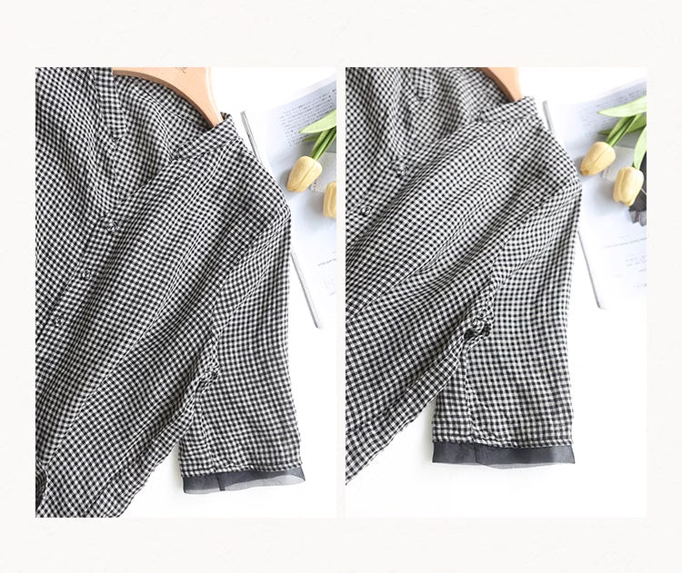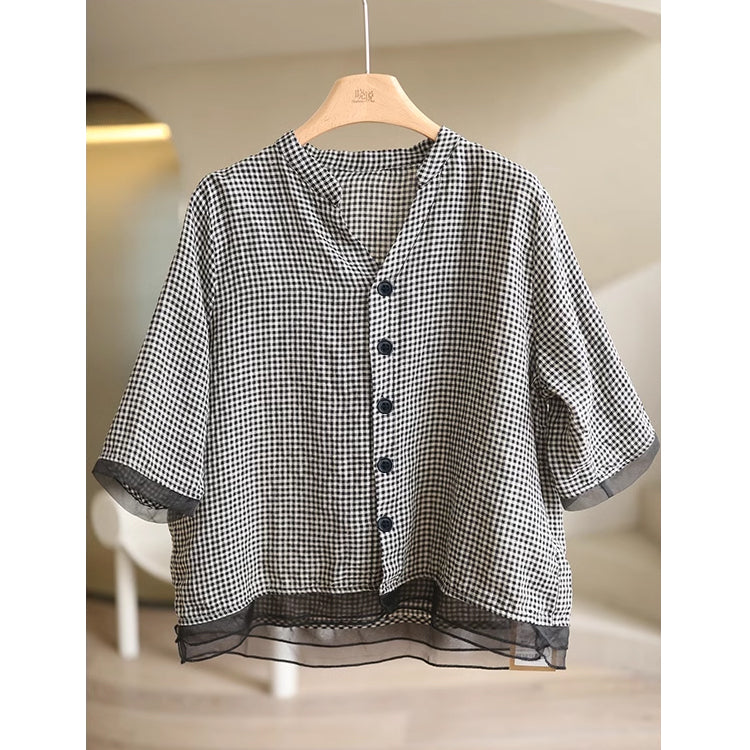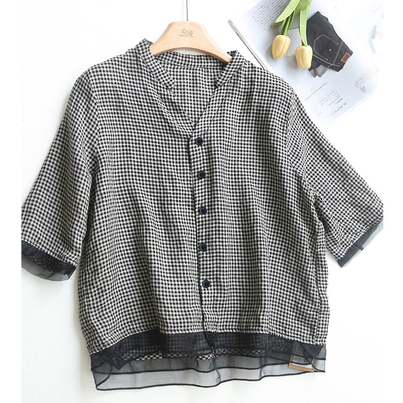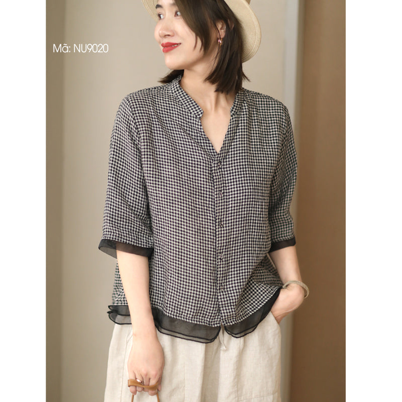 Áo sơ mi linen ngắn tay cổ đứng xẻ V kẻ caro - NU9020