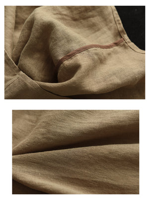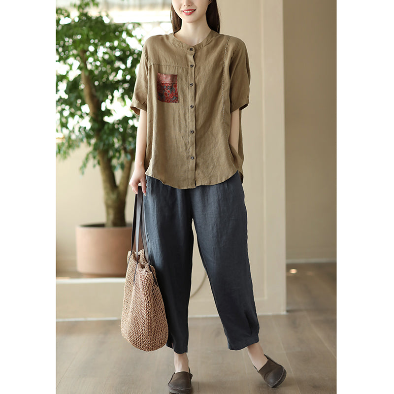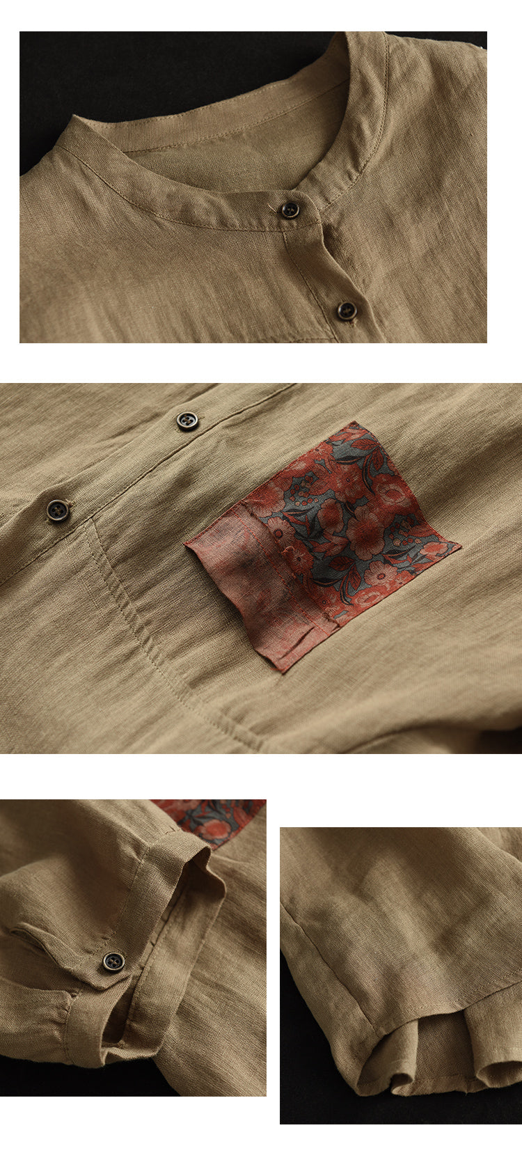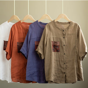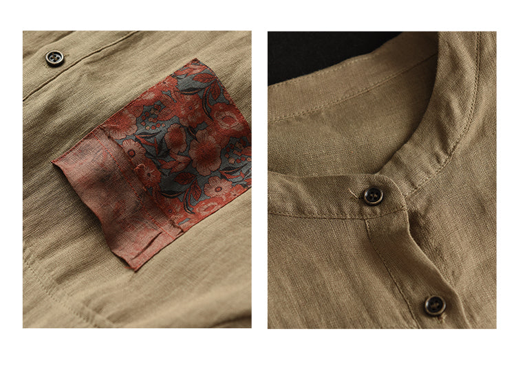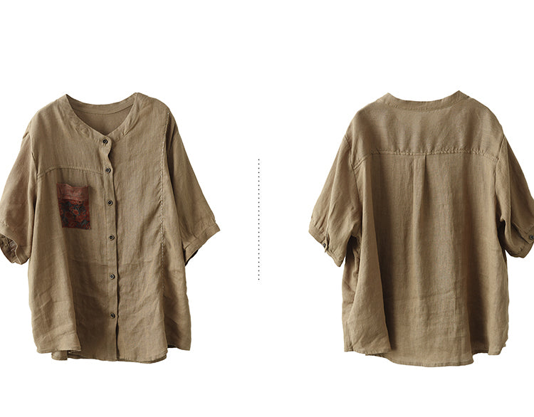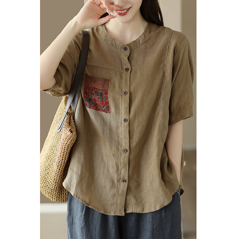 Áo sơ mi linen ngắn tay cổ tròn một túi hoa lá - NU8812
