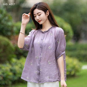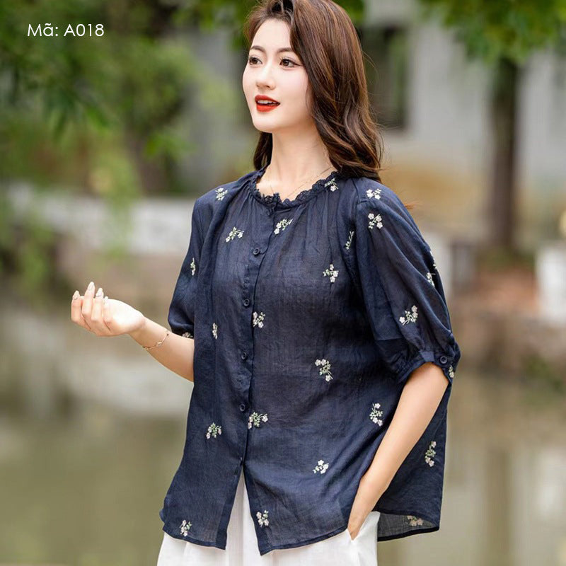 Áo sơ mi linen ngắn tay cổ tròn ren thêu những chùm hoa - A017