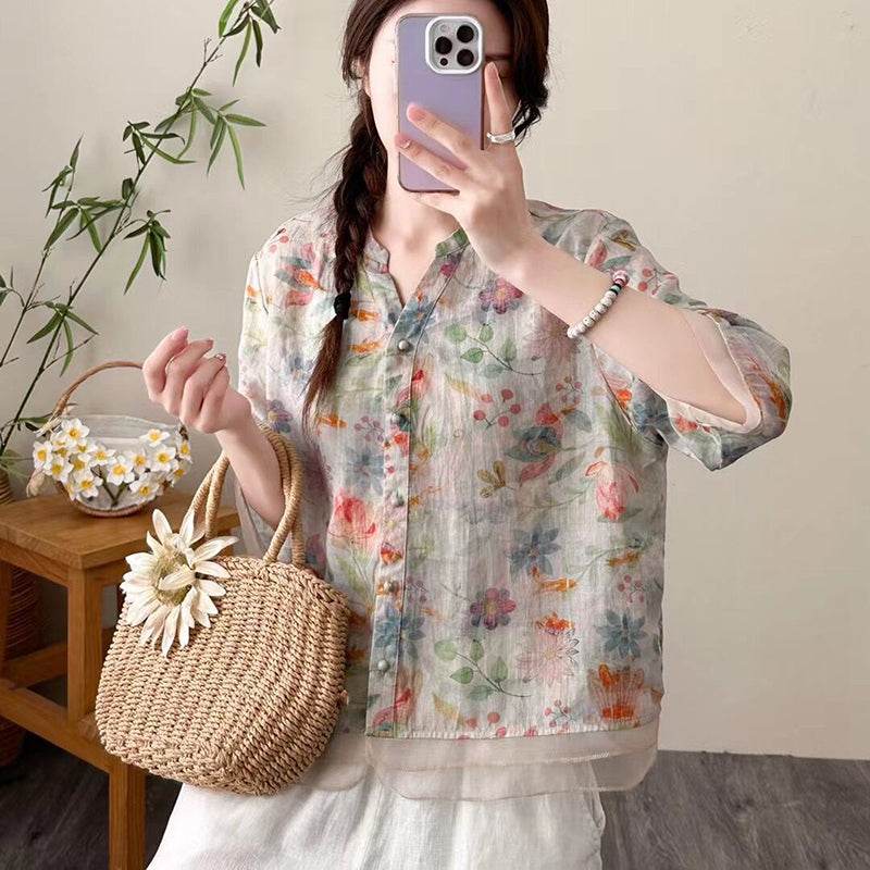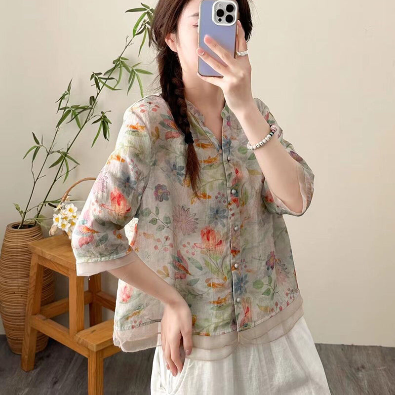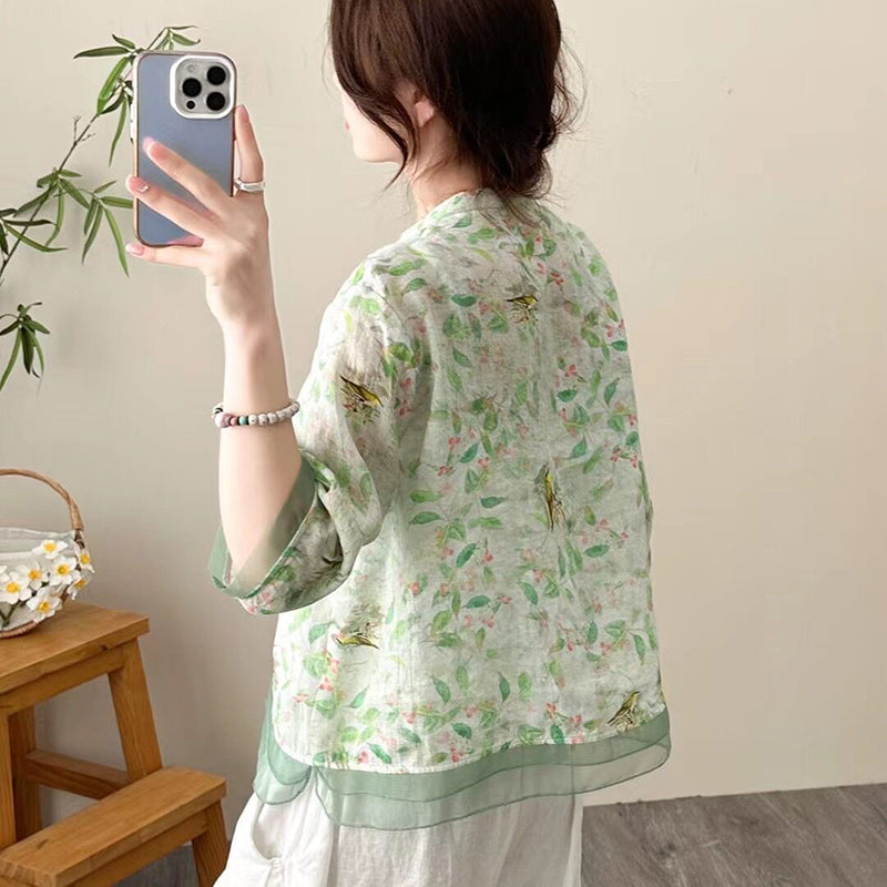 Áo sơ mi linen ngắn tay cổ V đính ren in hoa lá - NU9814