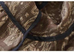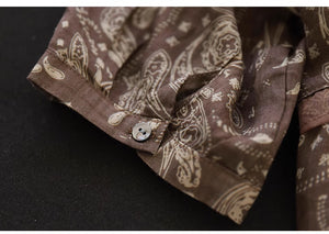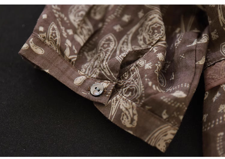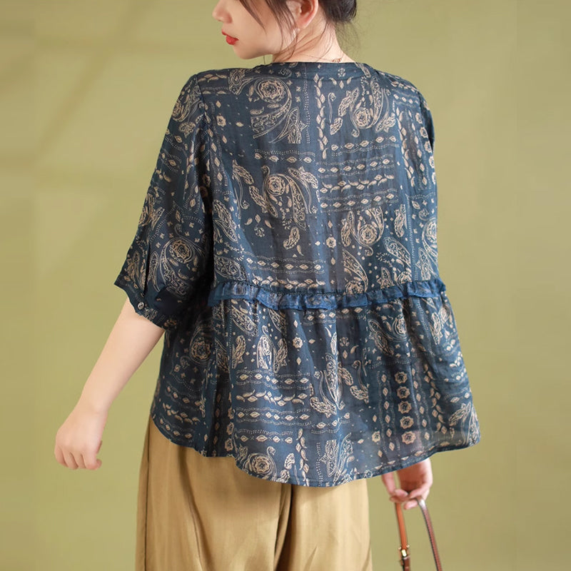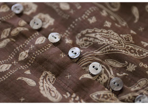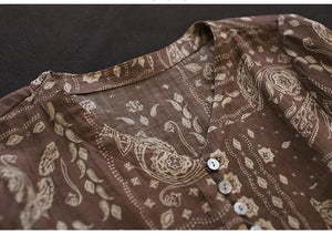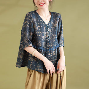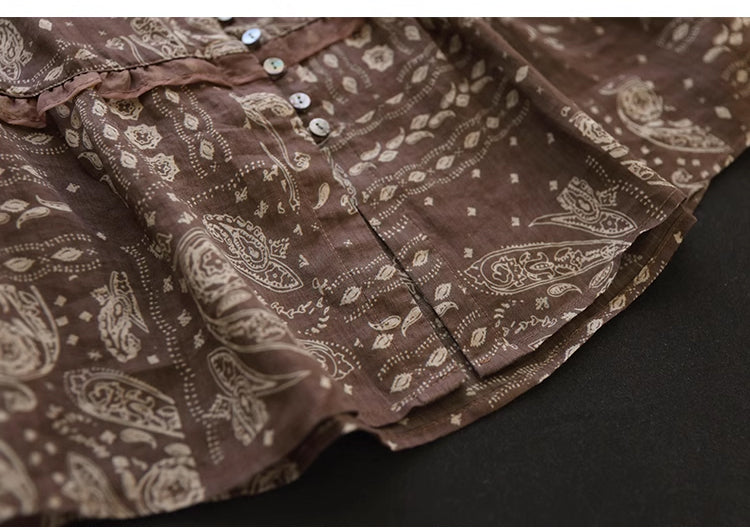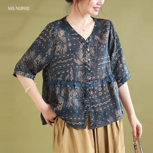 Áo sơ mi linen ngắn tay cổ V in retro kiểu đính ren - NU8930