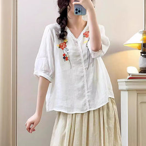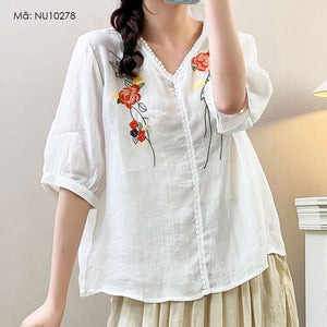 Áo sơ mi linen ngắn tay cổ V thêu hoa đối xứng trước ngực - NU10278