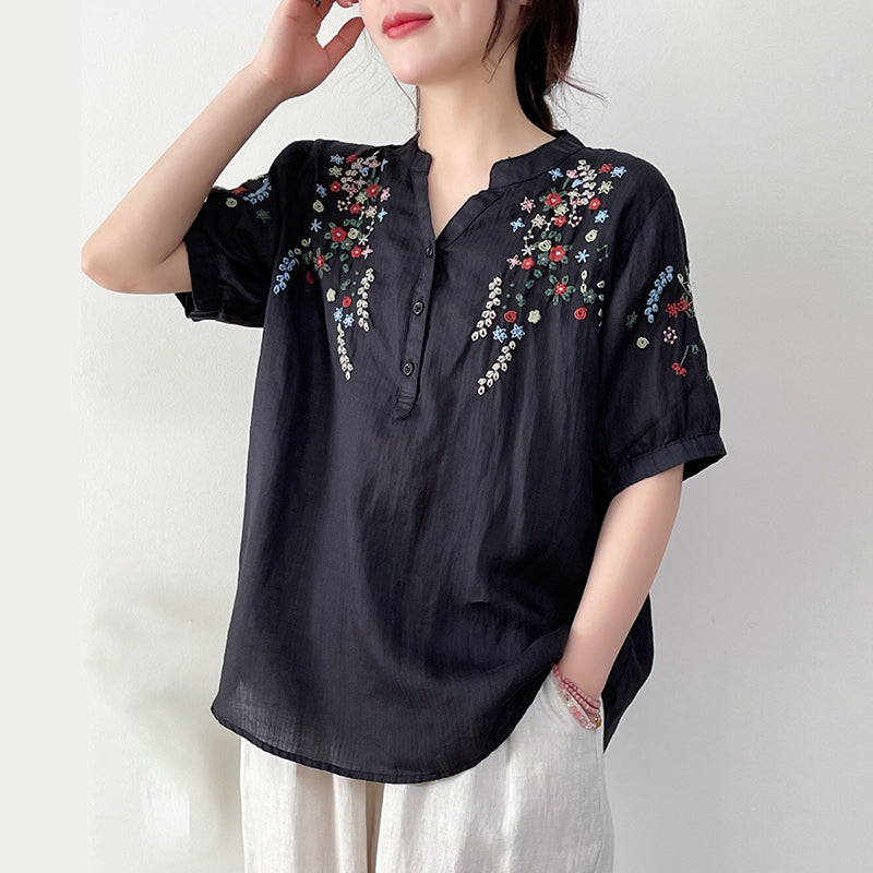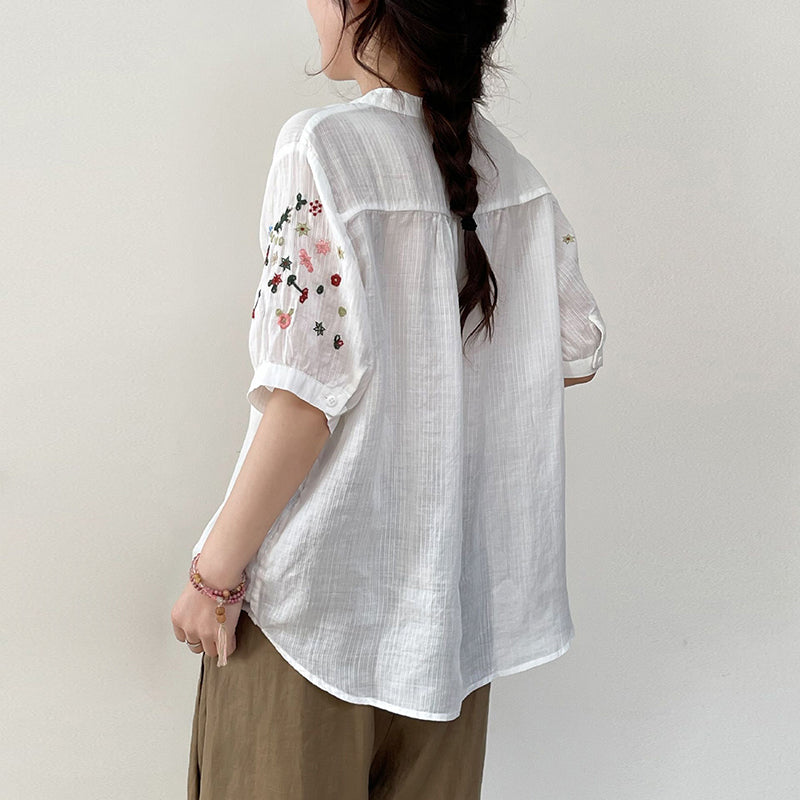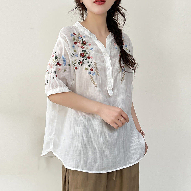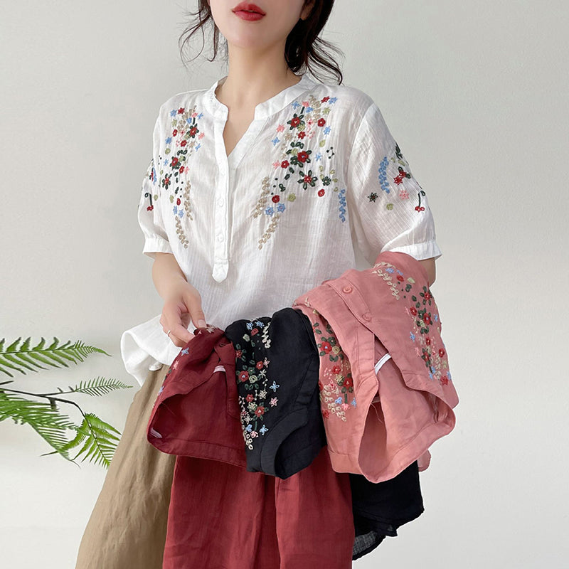 Áo sơ mi linen ngắn tay cổ V thêu hoa lá đối xứng - NU10157
