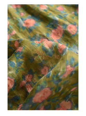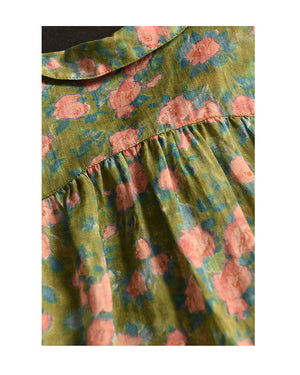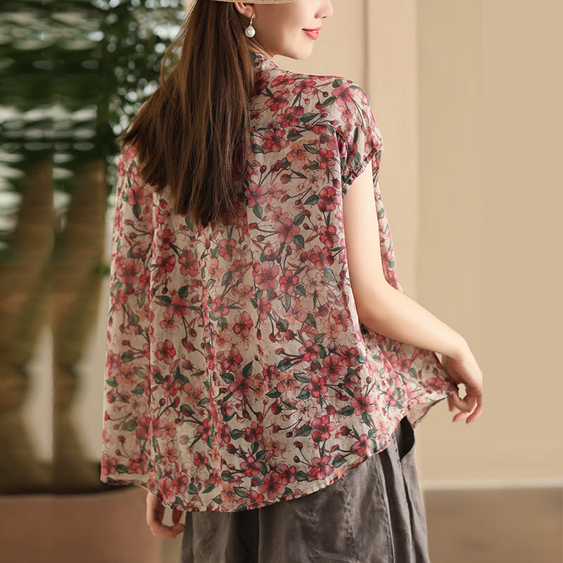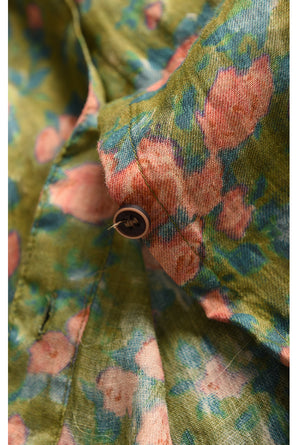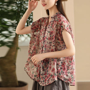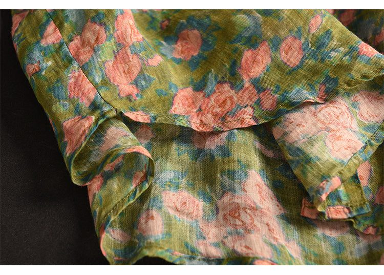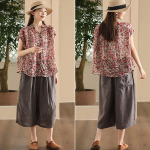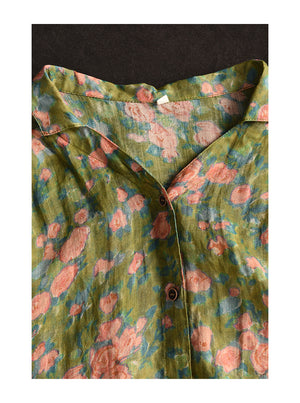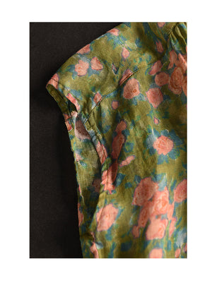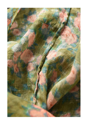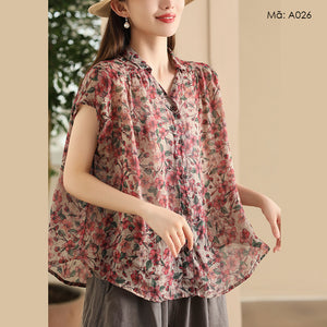 Áo sơ mi linen sát nách cổ đức xẻ V in hoa lá - A026