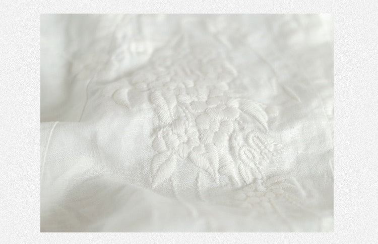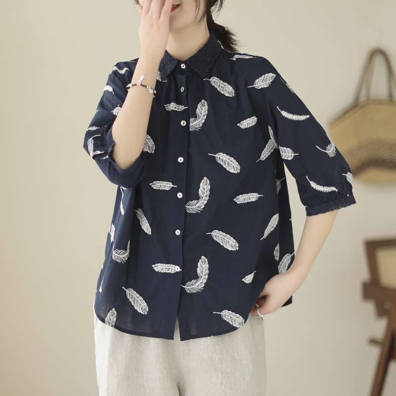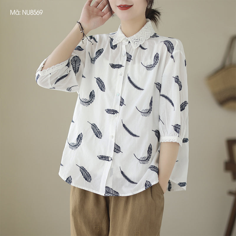 Áo sơ mi linen tay lửng cổ đức thêu retro in lông vũ - NU8568
