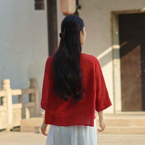 Áo sơ mi linen tay lửng cổ tròn kiểu đính ren - NU9749