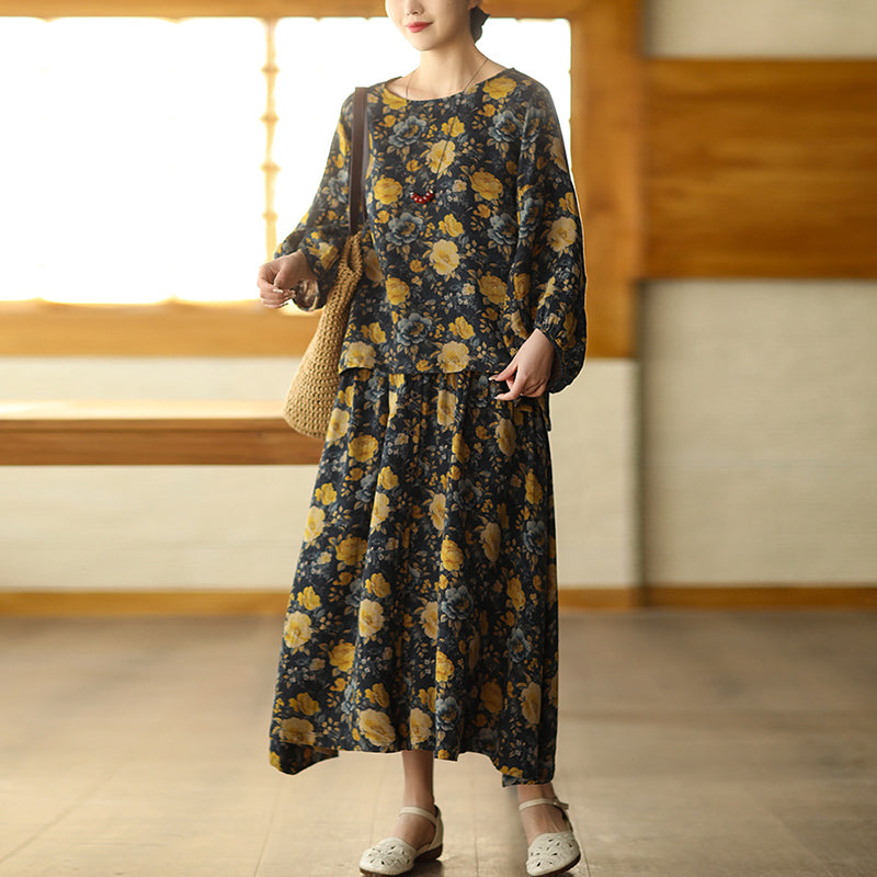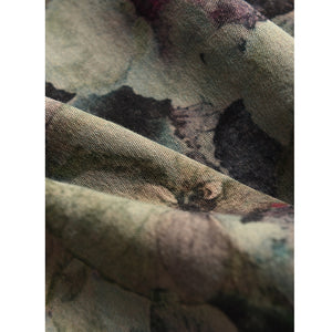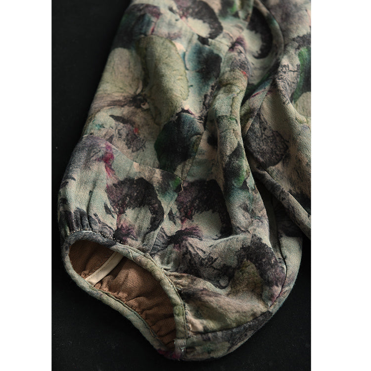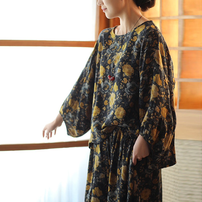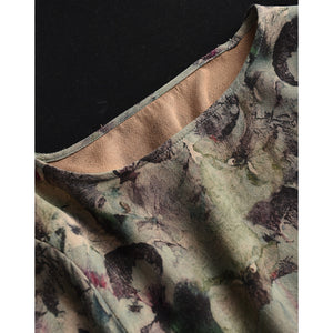 Áo sơ mi linen tay lửng cổ tròn vạt lệch in hoa lá - A718