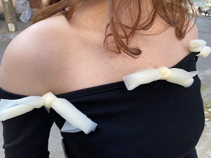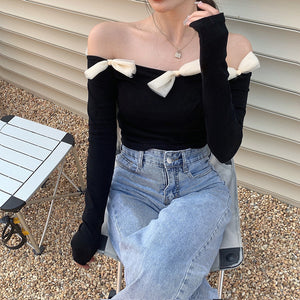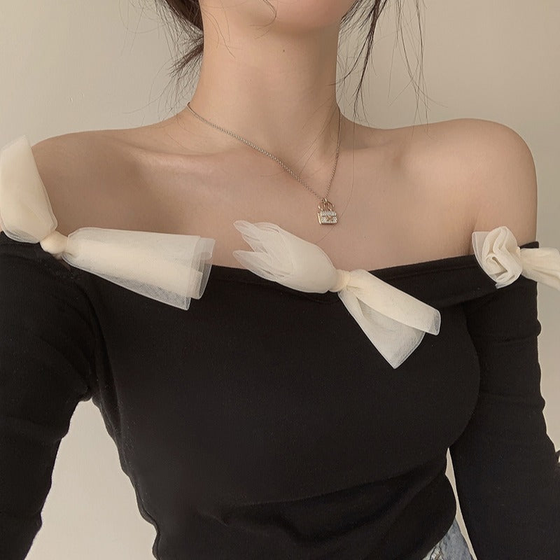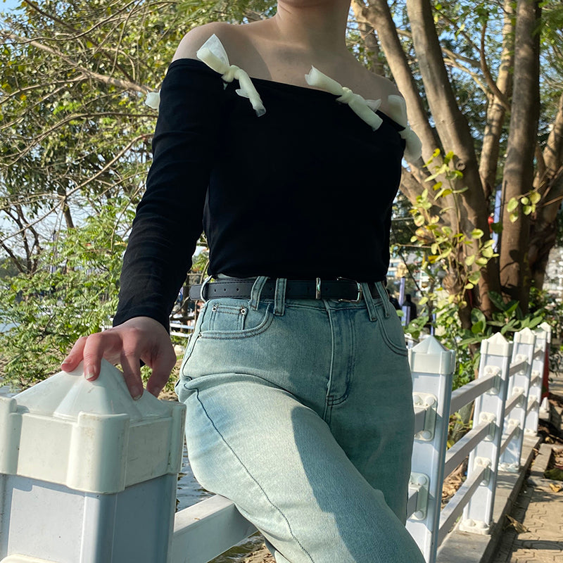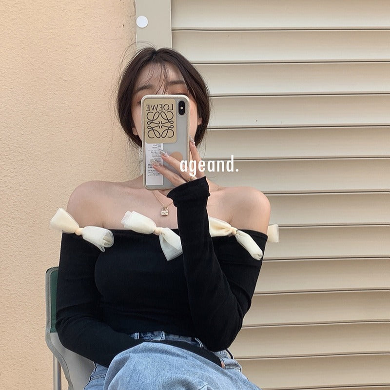 Áo T-shirt dài tay trễ vai kiểu đính nơ - NU8334