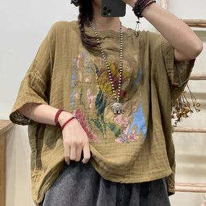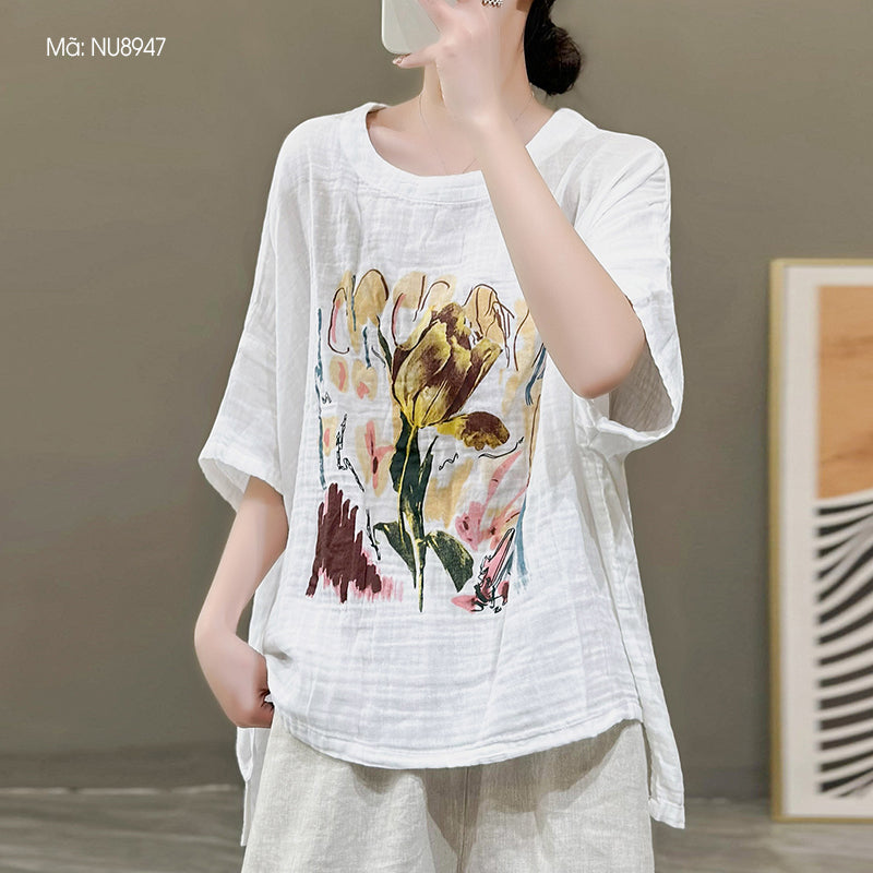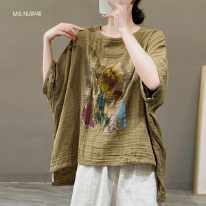 Áo T-shirt linen ngắn tay cánh dơi in hoa trừu tượng - NU8947