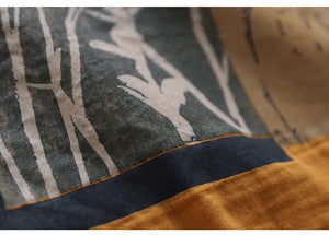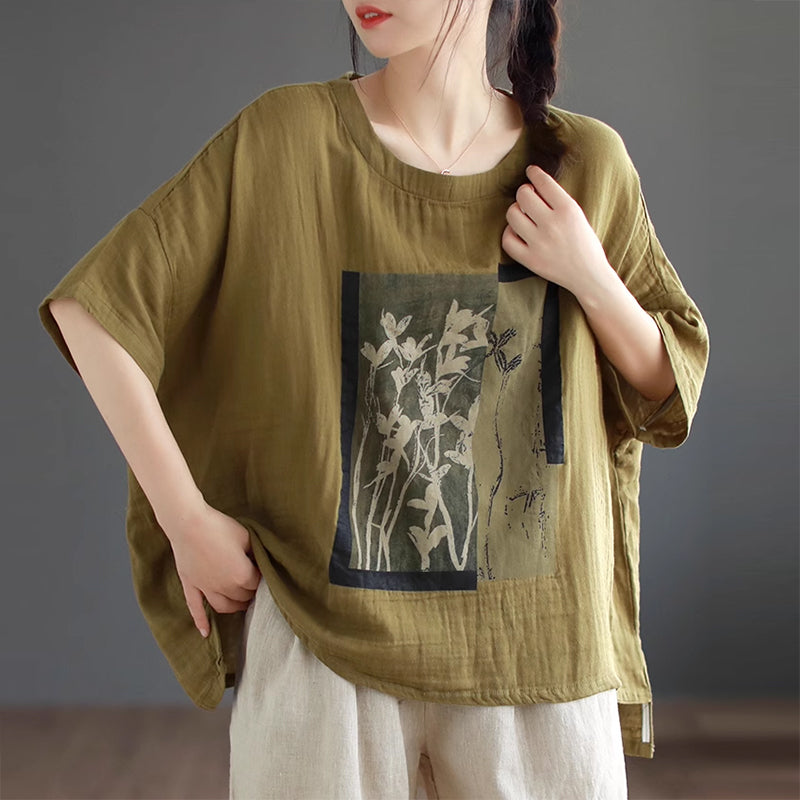 Áo T-shirt linen ngắn tay cổ tròn form rộng in hoa lá - NU8898