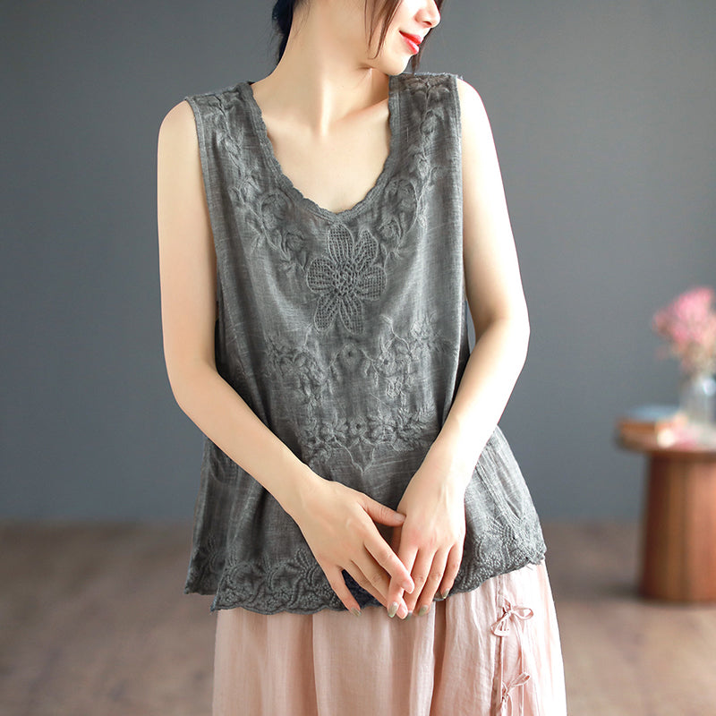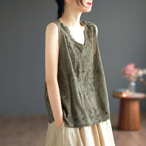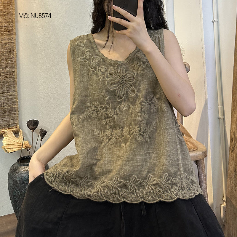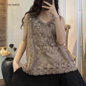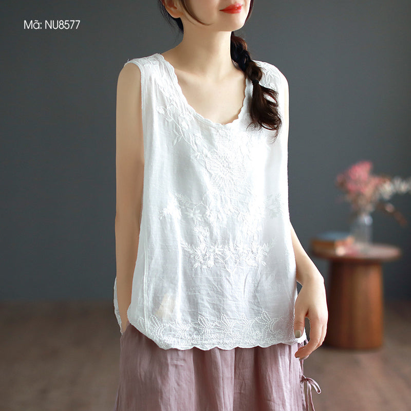 Áo T-shirt linen sát nách cổ tròn thêu hoa lá đơn sắc - NU8574