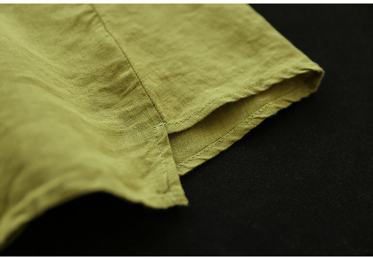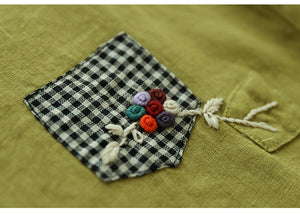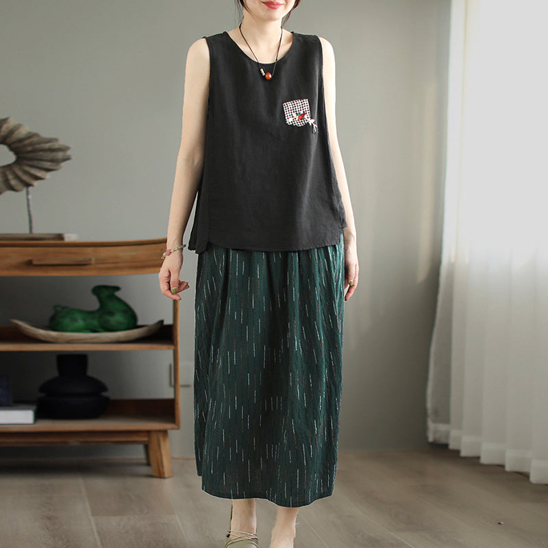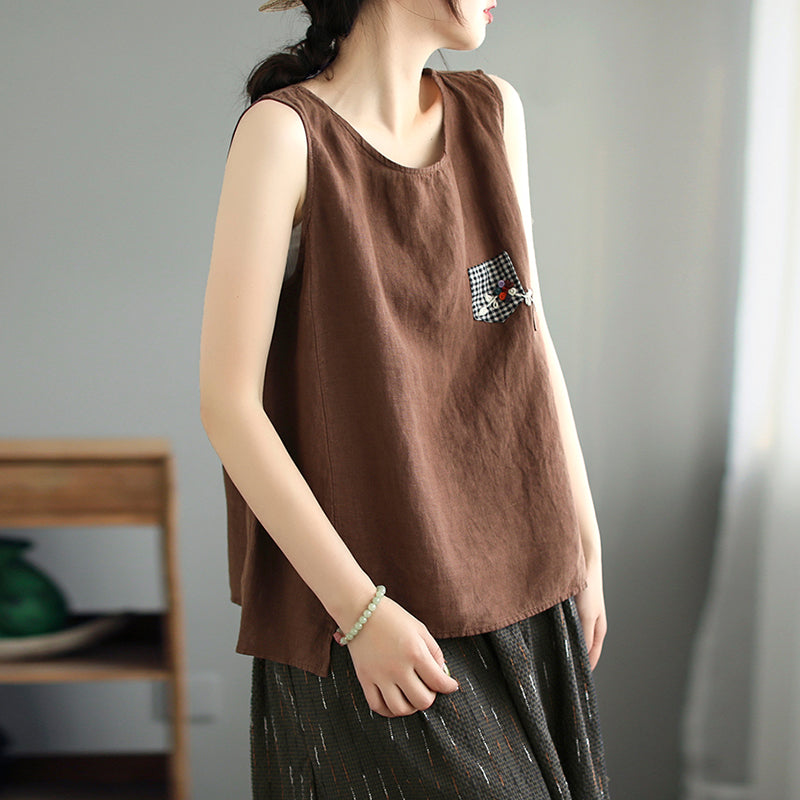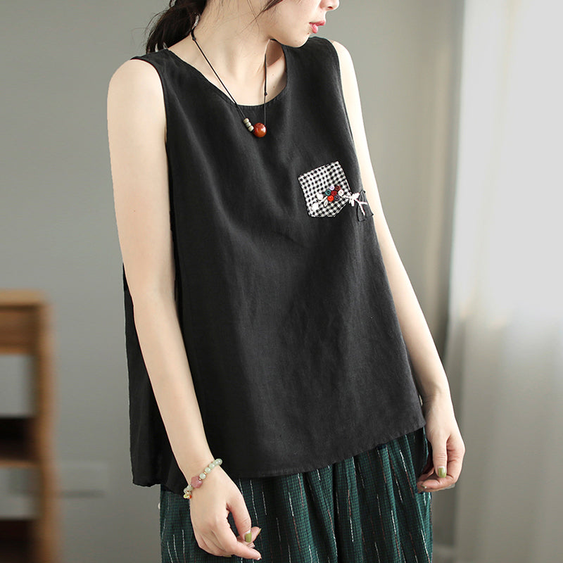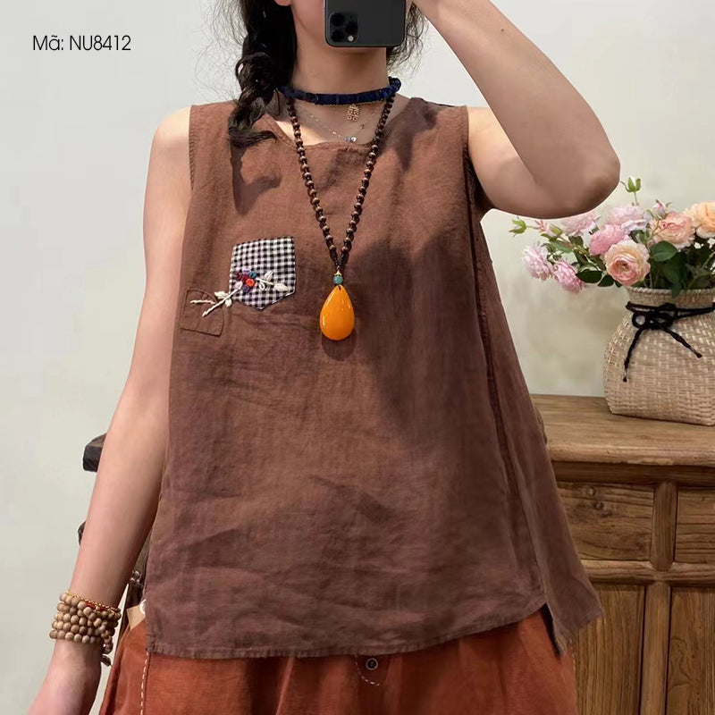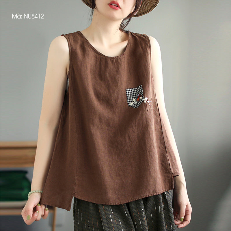 Áo T-shirt linen sát nách cổ tròn túi caro thêu hoa - NU8412