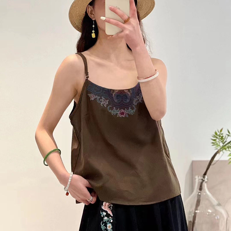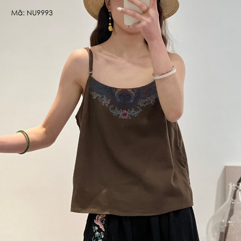 Áo T-shirt linen sát nách hai dây thêu hoa văn retro - NU9993