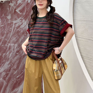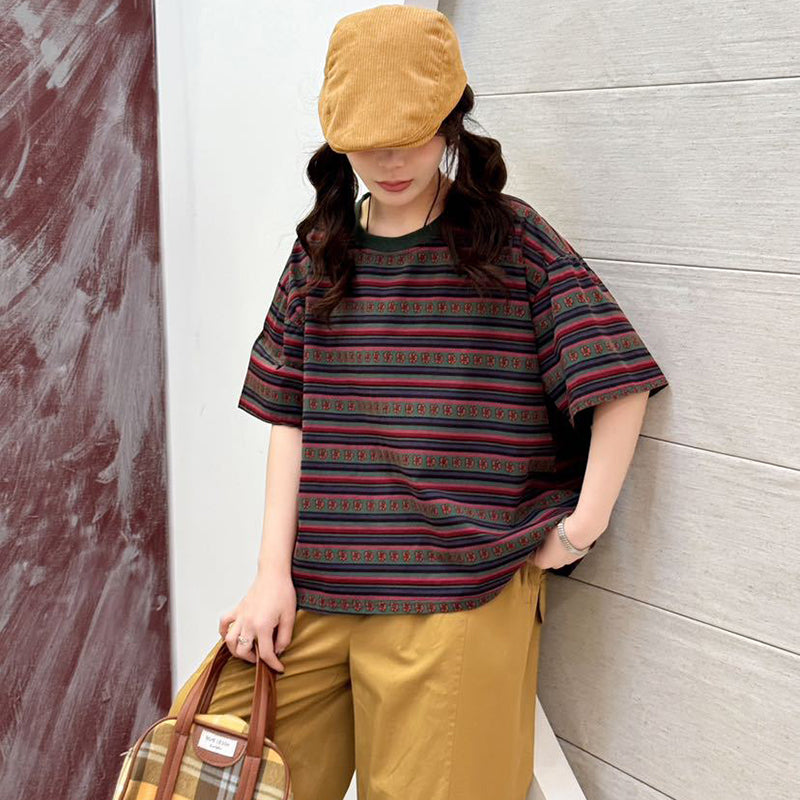 Áo T-shirt ngắn tay cổ tròn kẻ sọc in hoa retro - A750