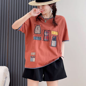 Áo T-shirt ngắn tay thêu ba chú mèo cổ tròn - NU9962