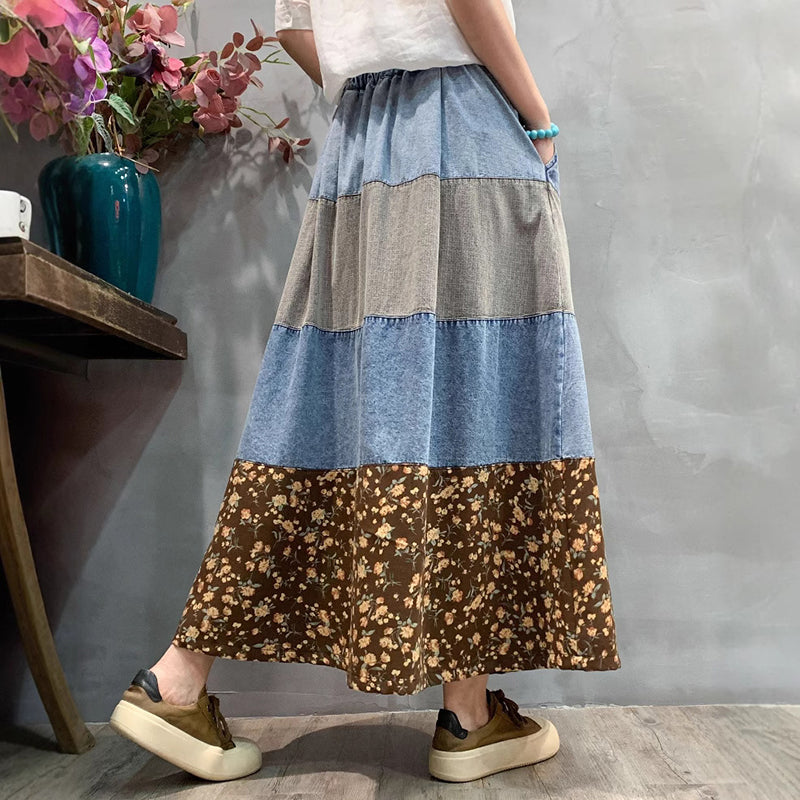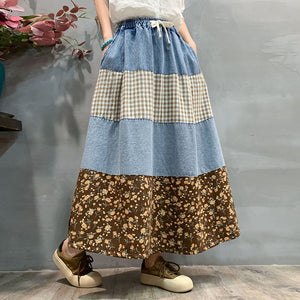 Chân váy denim lưng thun in hoa lá phối caro - V076