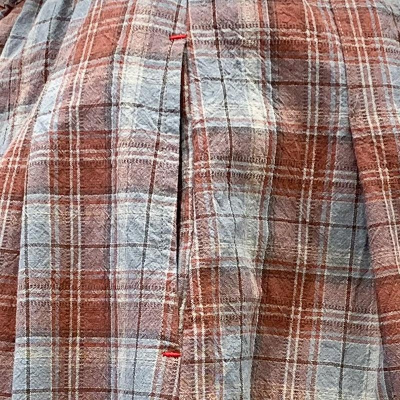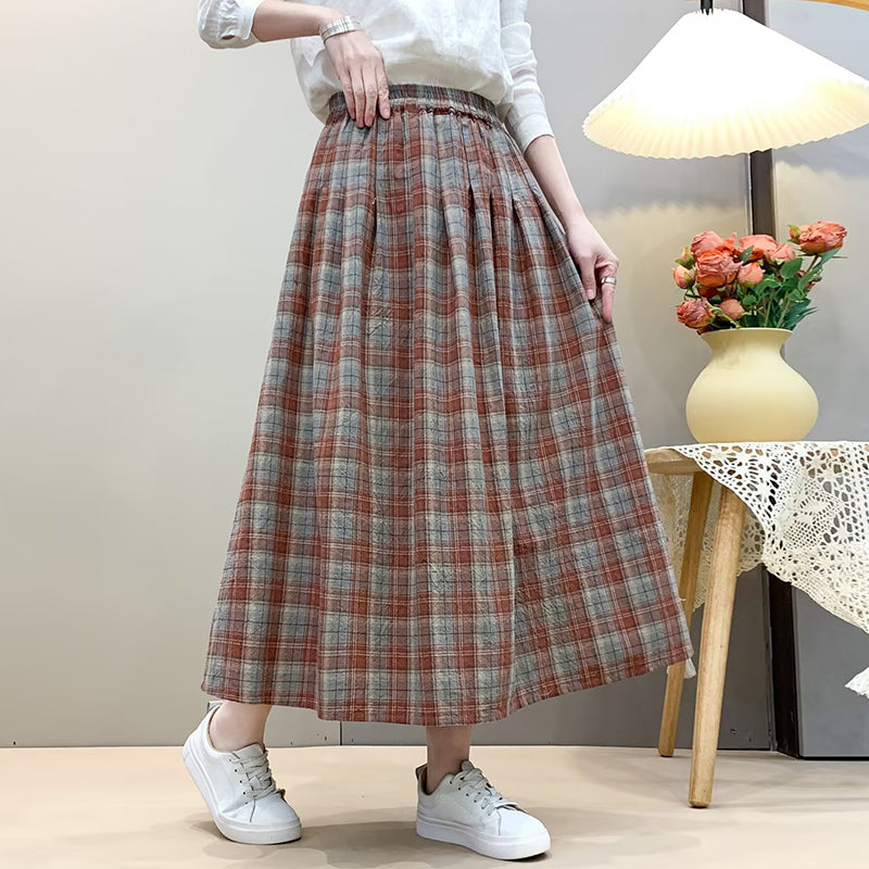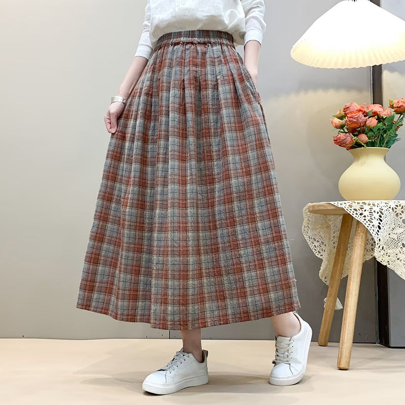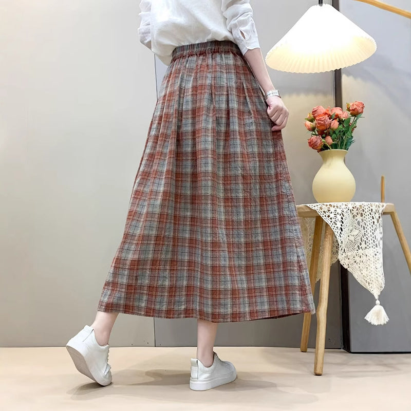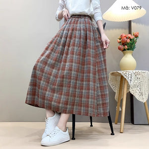 Chân váy linen lưng thun hai túi kẻ caro - V079