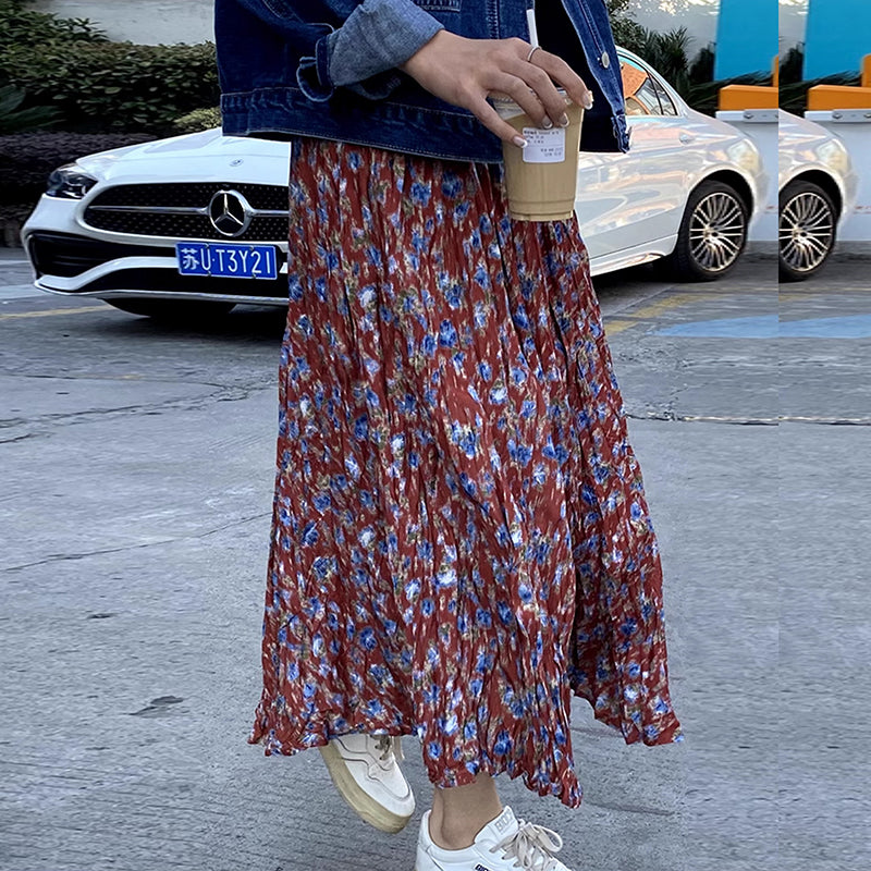 Chân váy linen retro lưng thun xếp ly in hoa lá - NU10041