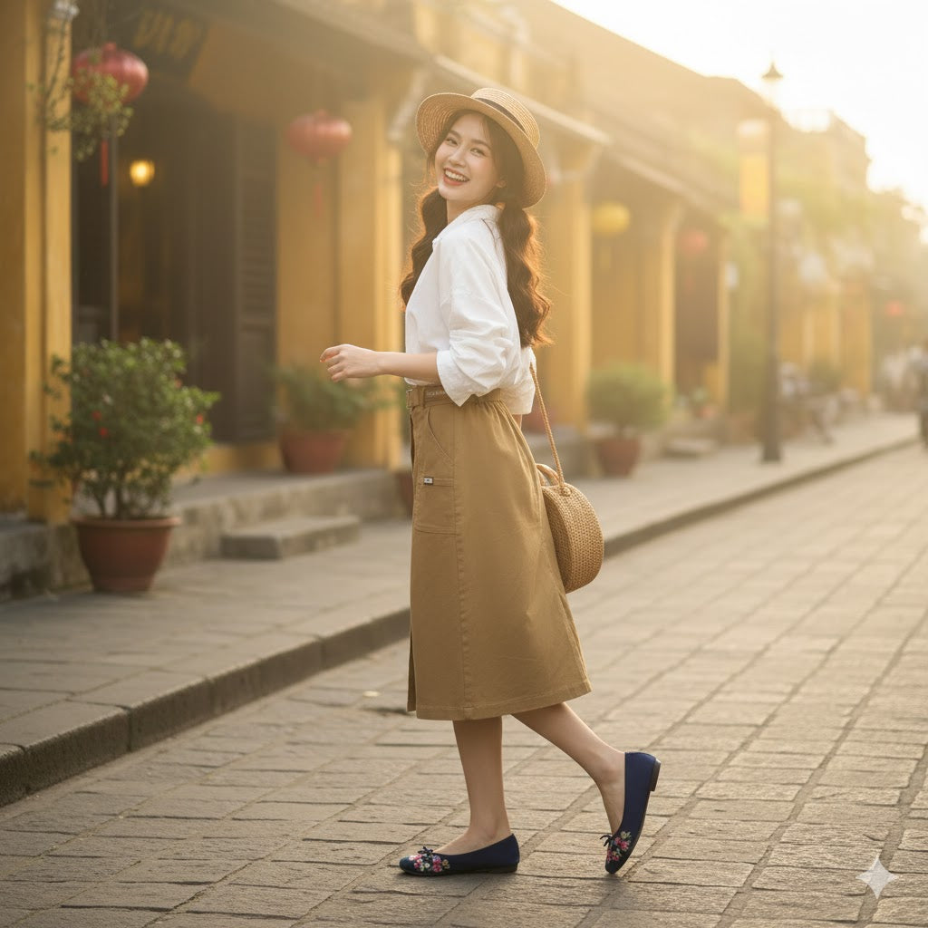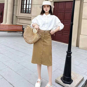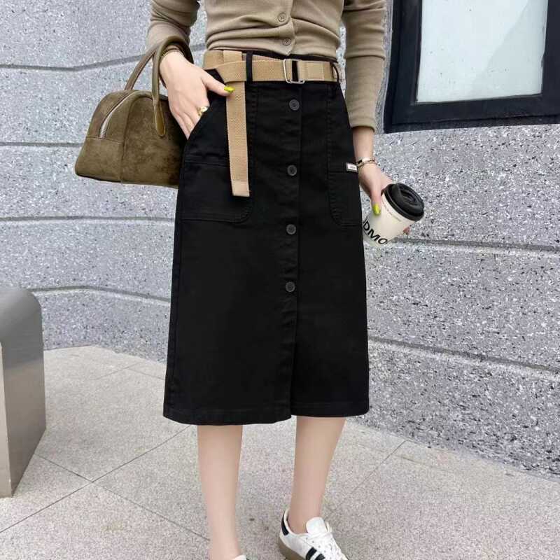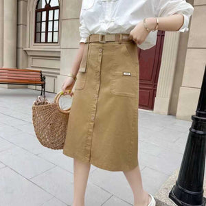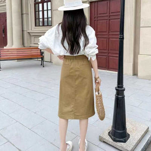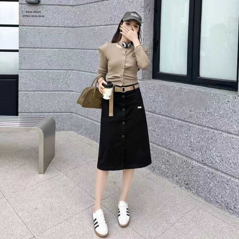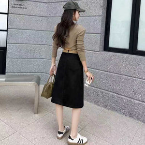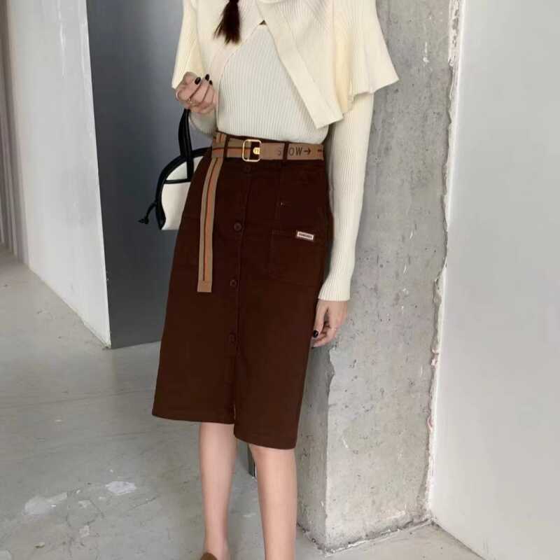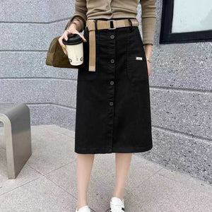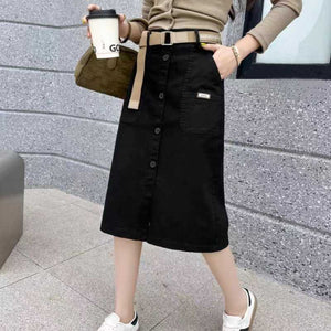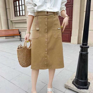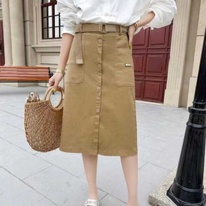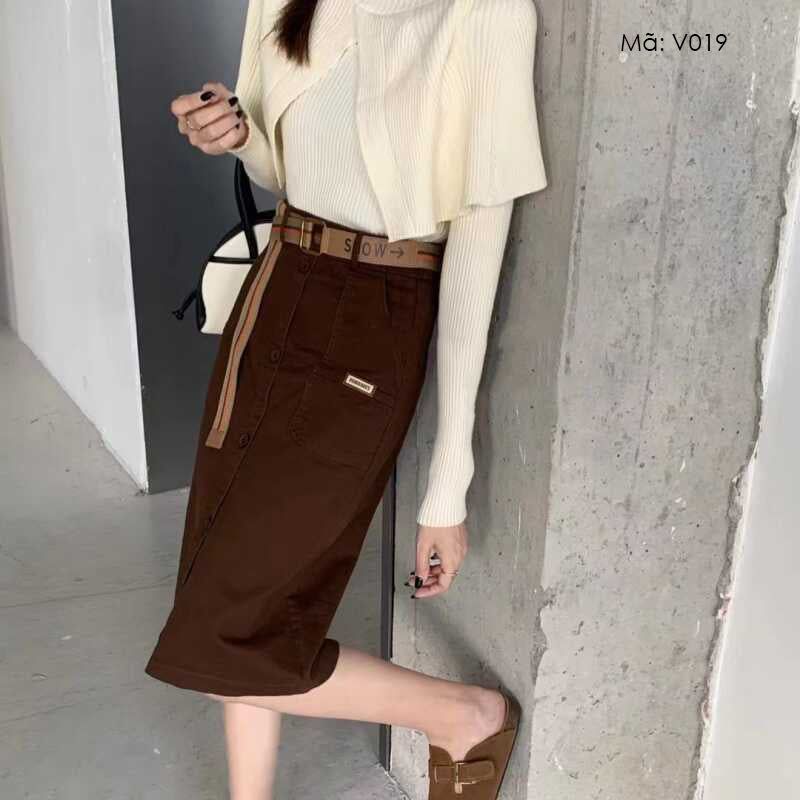 Chân váy retro bốn khuy cài kiểu xẻ trước kèm thắt lưng - V017