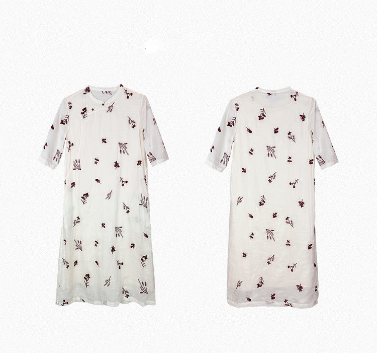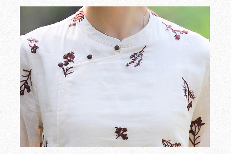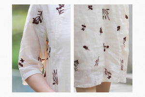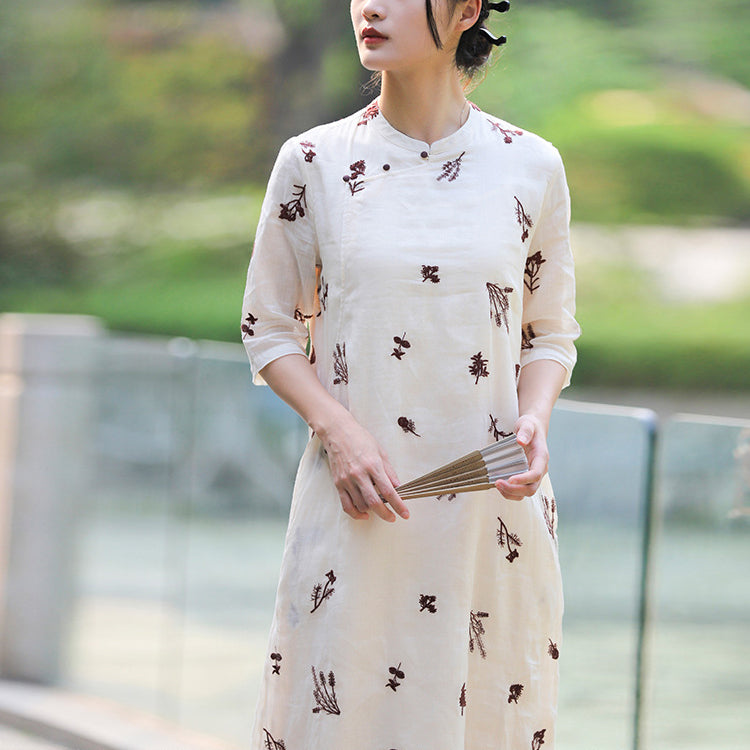 Đầm liền linen ngắn tay cổ tàu thêu hoa oải hương - NU10511