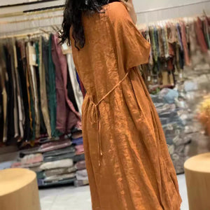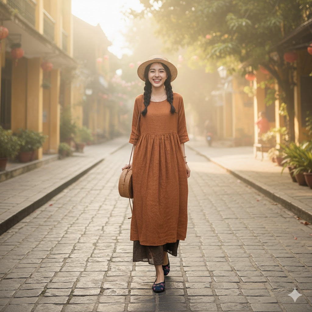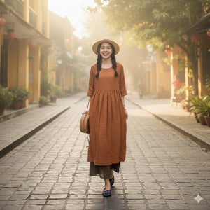 Đầm liền linen ngắn tay cổ tròn eo xếp ly dây rút - NU10425