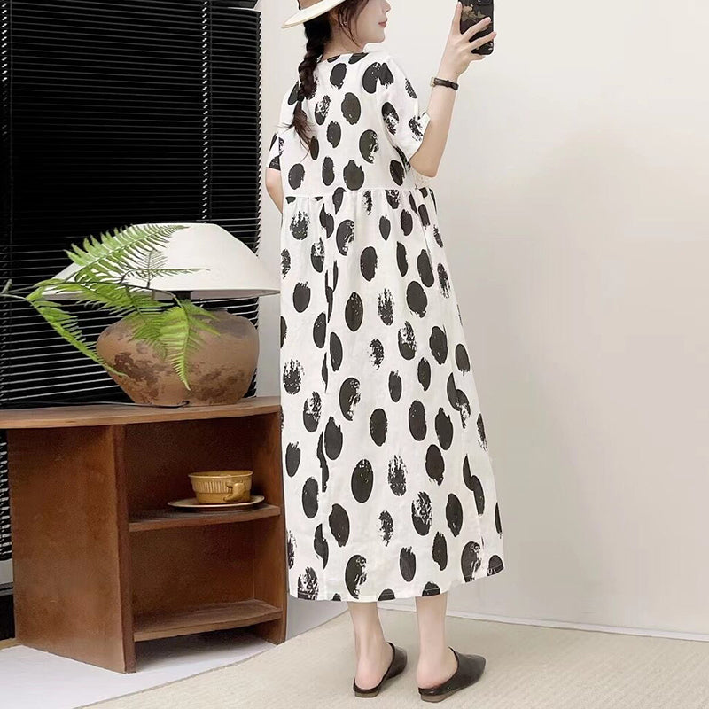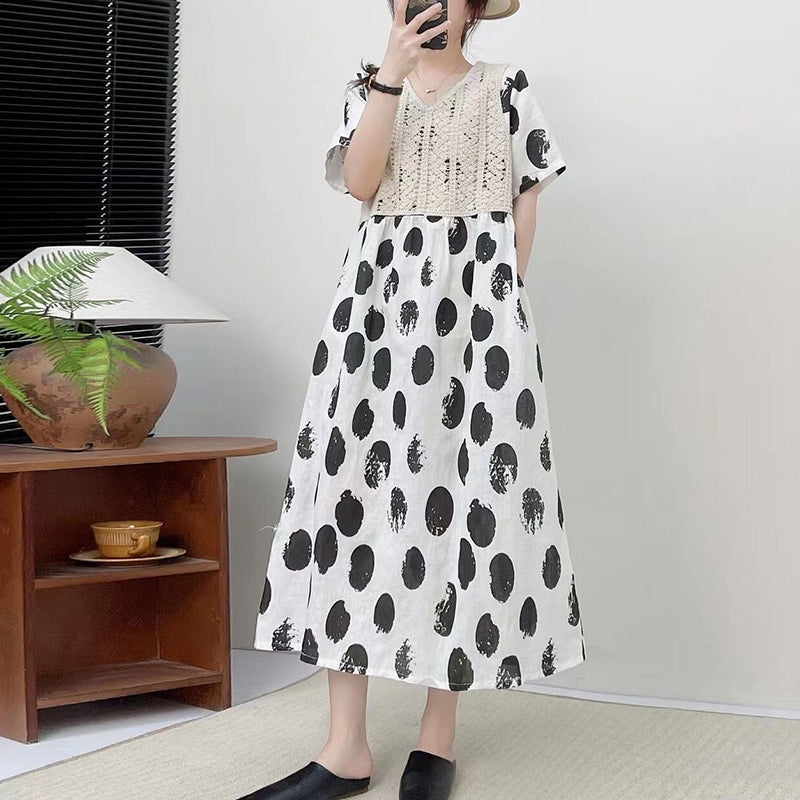 Đầm liền linen ngắn tay cổ V chấm bi đan móc - NU10145
