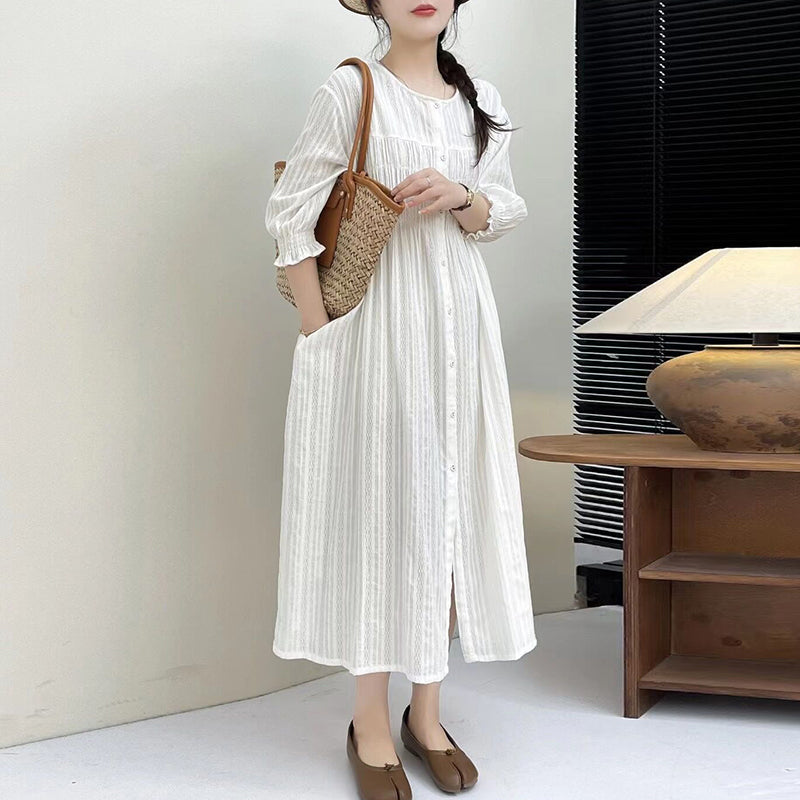 Đầm liền linen sơ mi tay lửng cổ tròn - NU10102