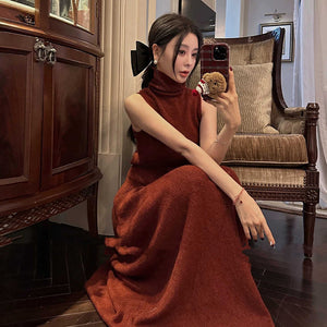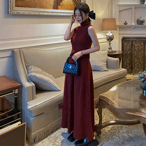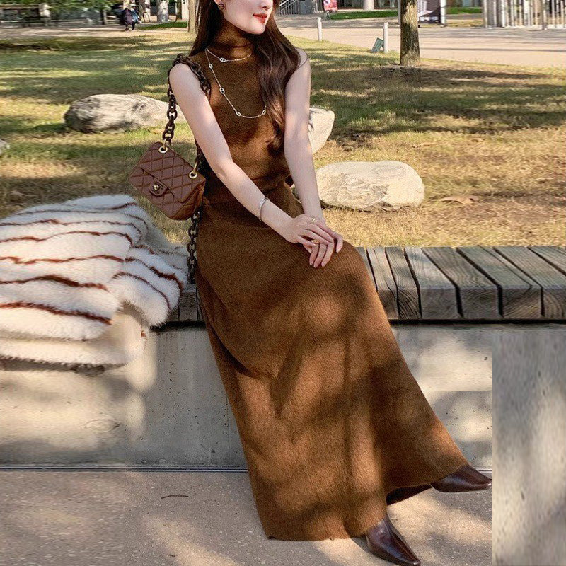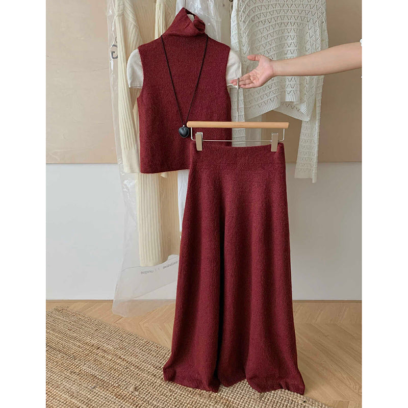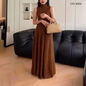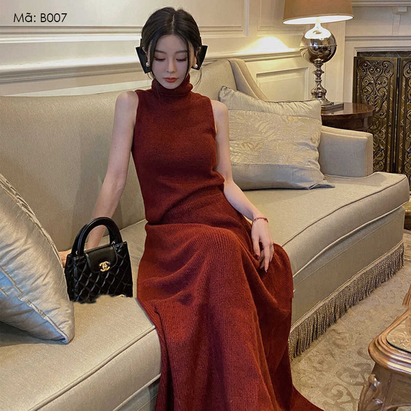 Bộ đồ len gồm áo T-shirt sát nách cao cổ và chân váy xòe - B006