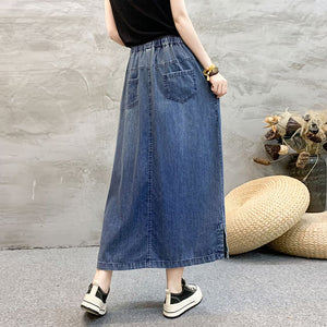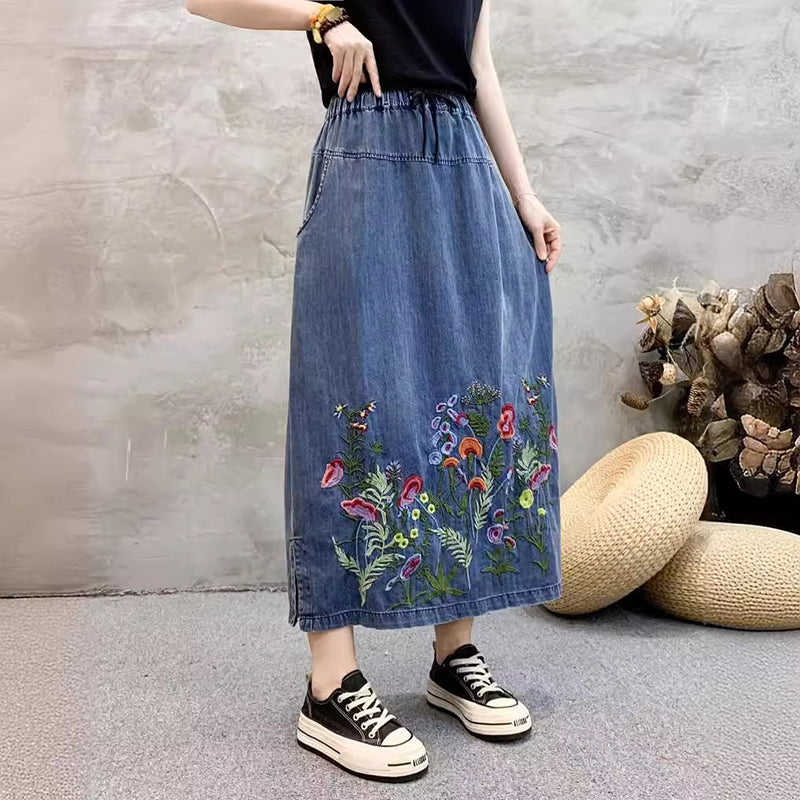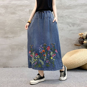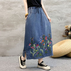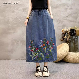 Chân váy denim lưng thun dây rút thêu hoa lá sắc màu - NU10492
