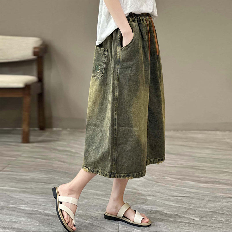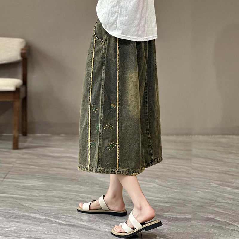 Chân váy denim lưng thun dây rút thêu hoa một bên - NU9192