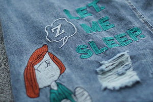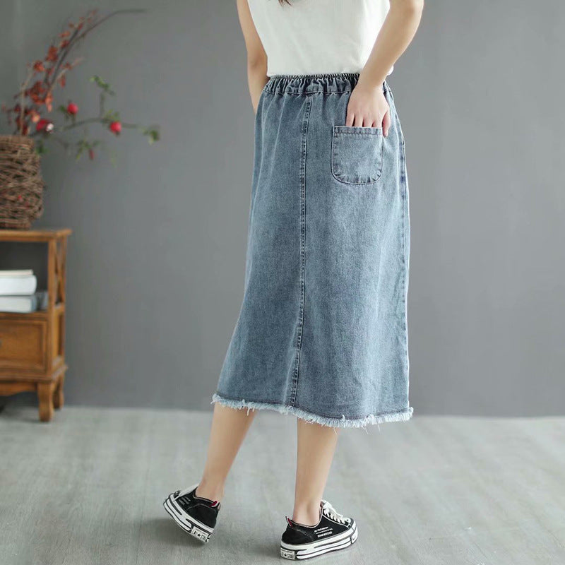 Chân váy denim lưng thun thêu cô bé xẻ tà - NU8658