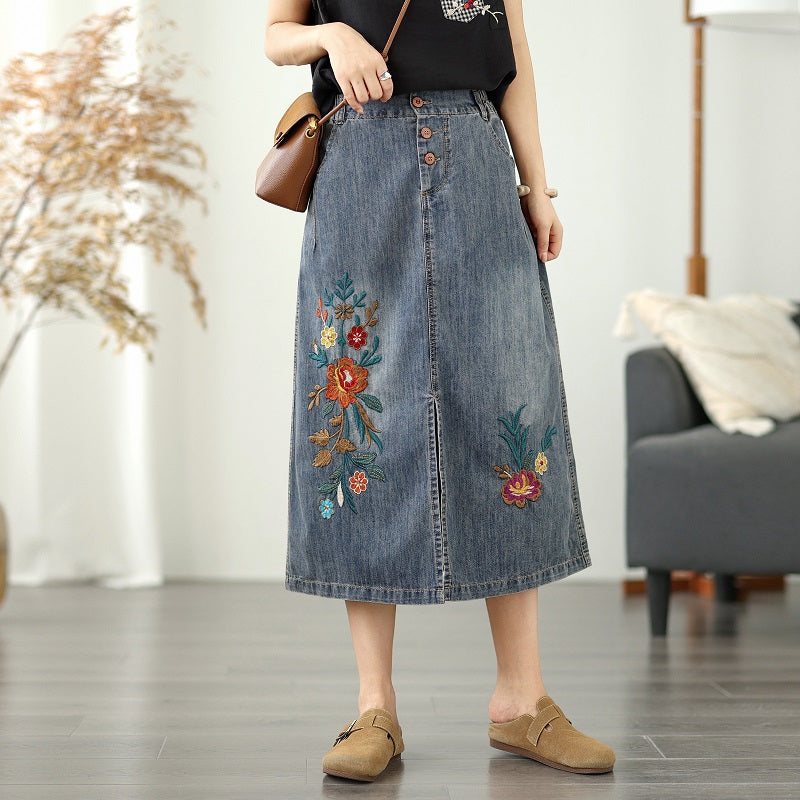 Chân váy denim lưng thun thêu hoa lá vạt xẻ trước - V106
