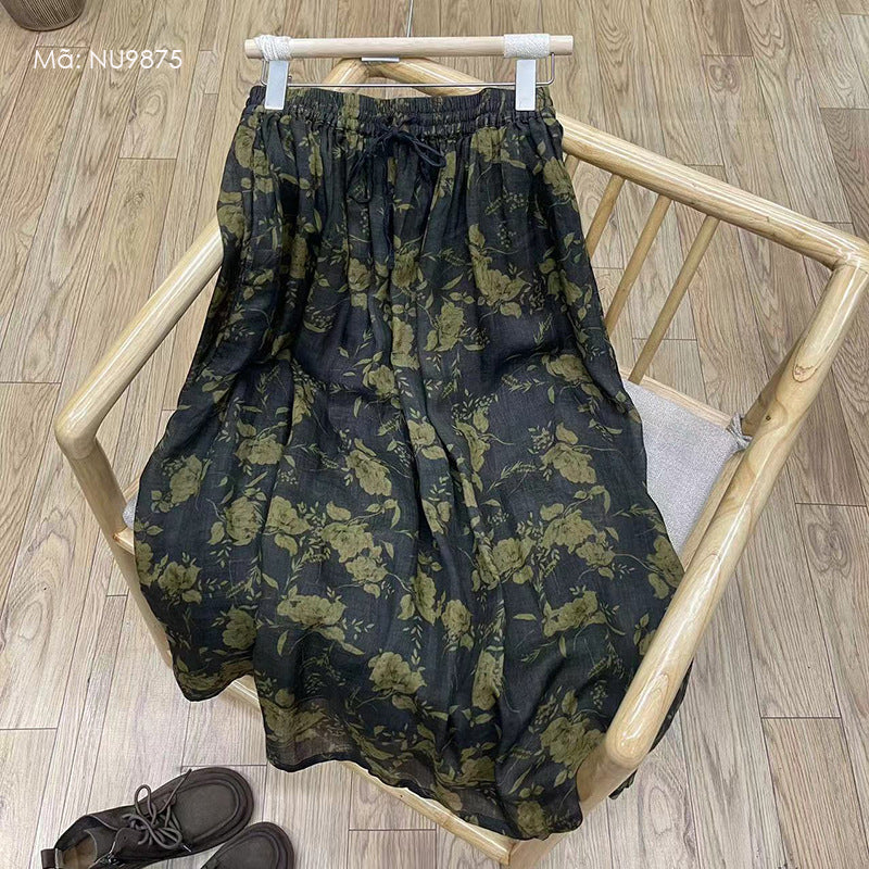 Chân váy linen lưng thun retro in hoa lá - NU9875