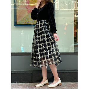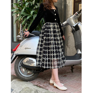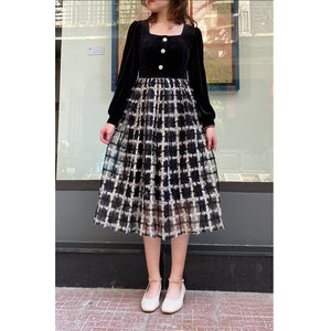 Đầm liền dài tay cổ vuông váy caro - NU8335