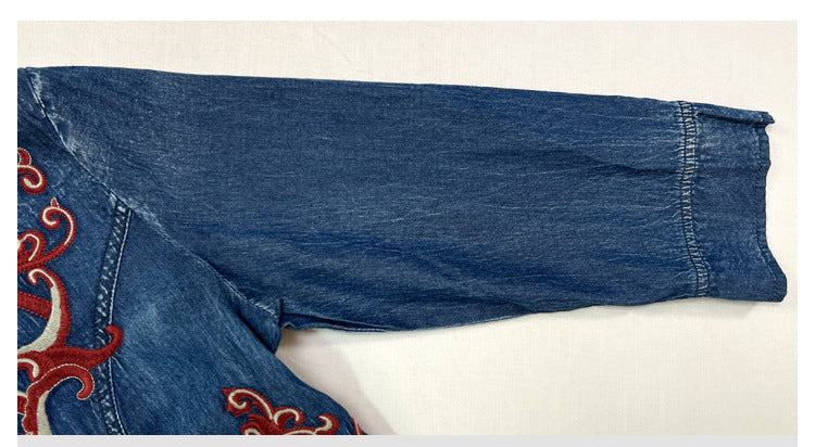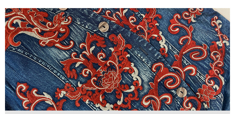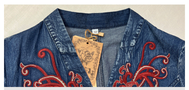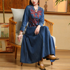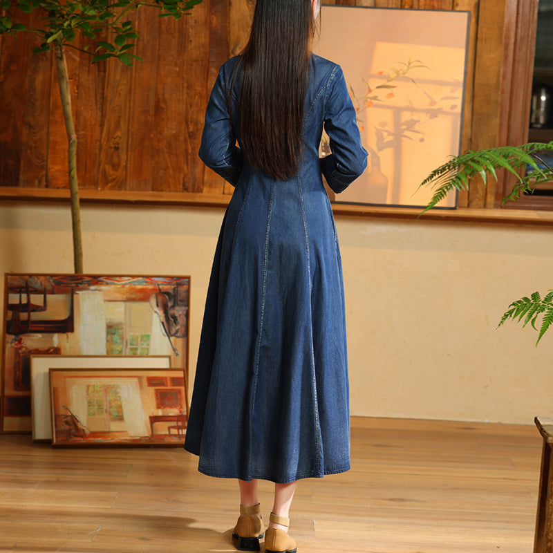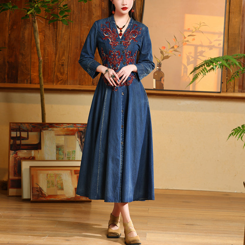 Đầm liền denim tay lửng cổ V khuy cài thêu hoa văn retro - NU9370