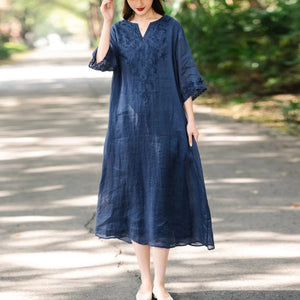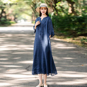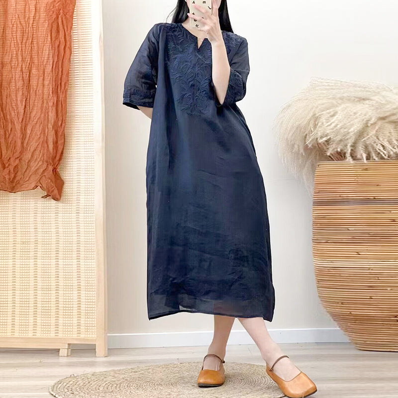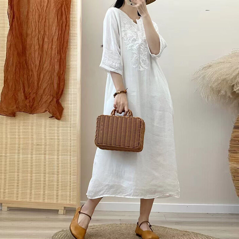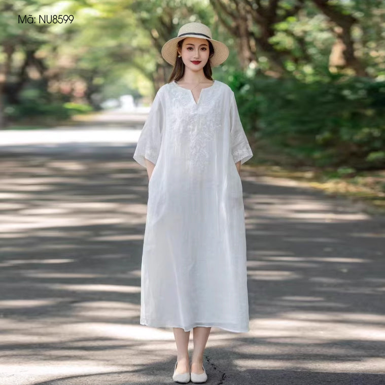 Đầm liền linen cổ tròn xẻ V ngắn tay thêu hoa văn retro - NU8598