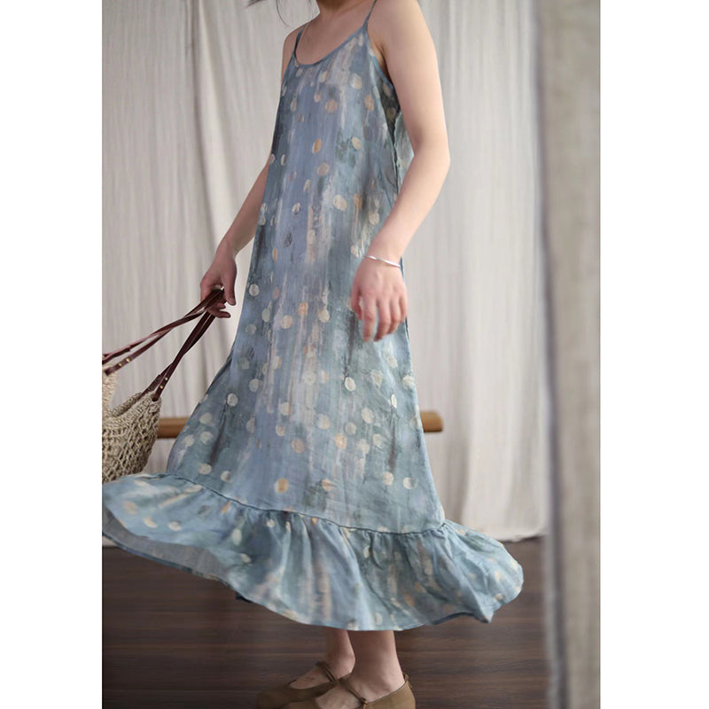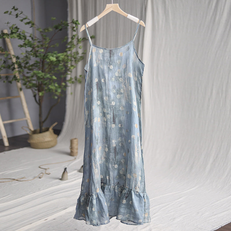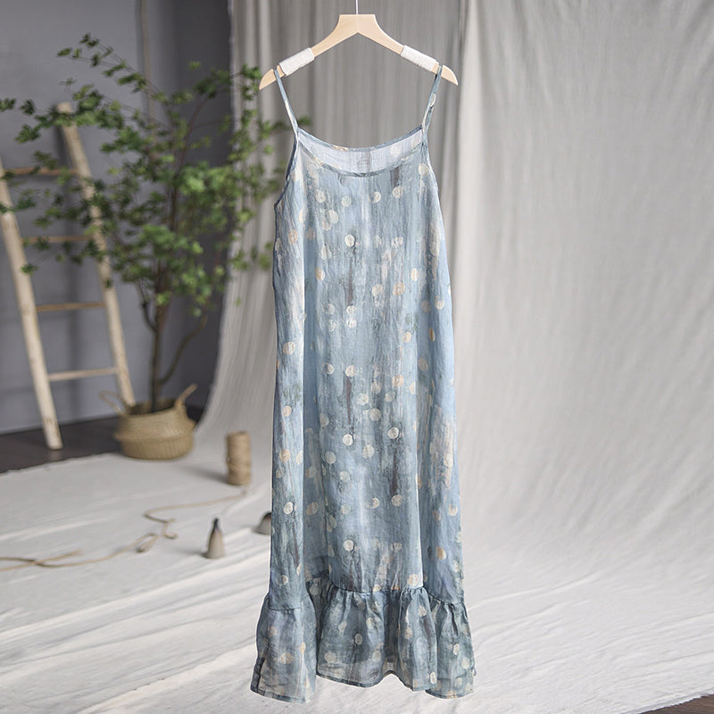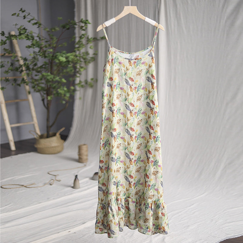 Đầm liền linen hai dây in hoa lá tùng xòe - NU7126