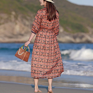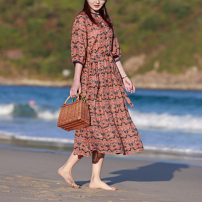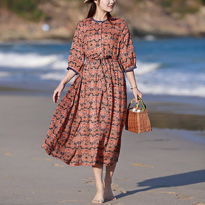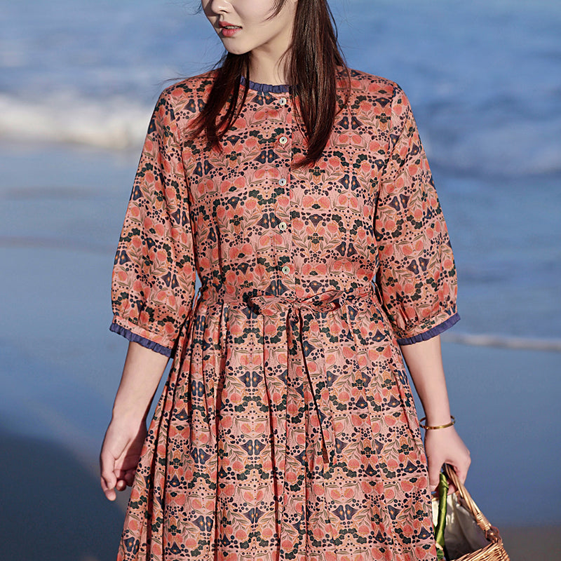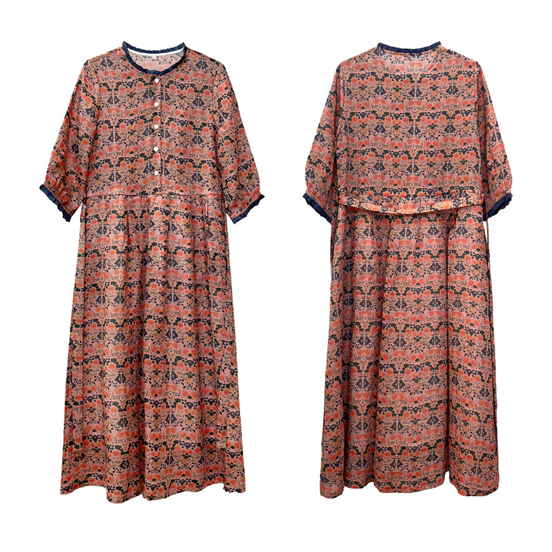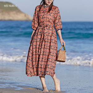 Đầm liền linen ngắn tay cổ tròn hoa văn đối xứng - NU8510