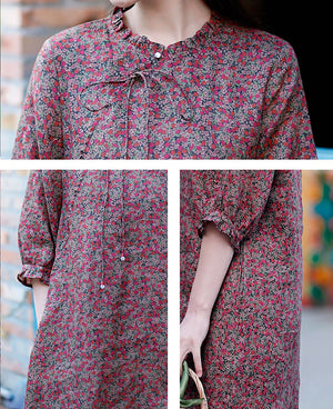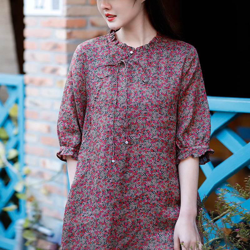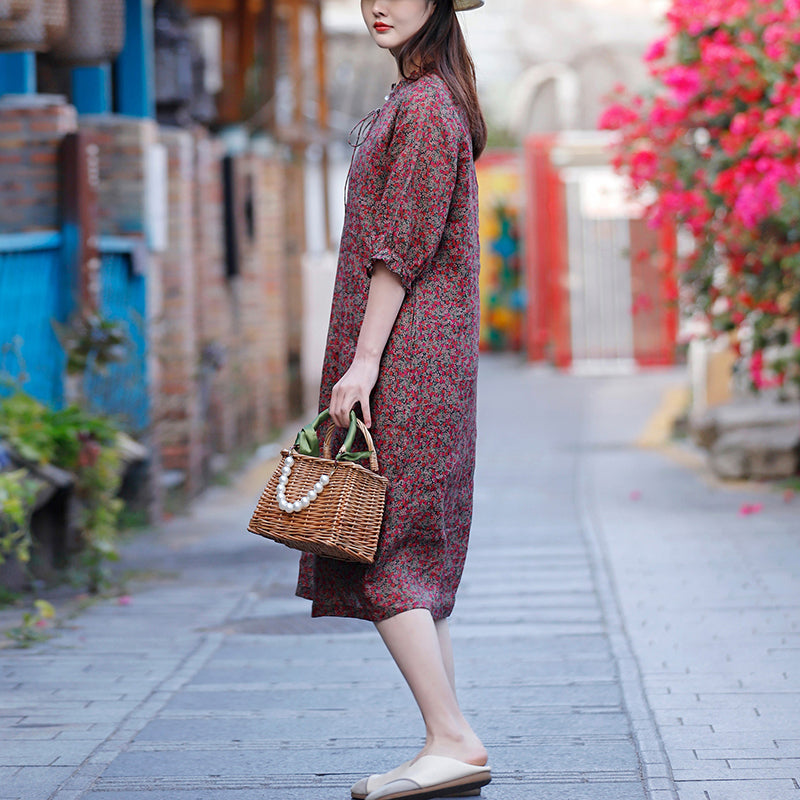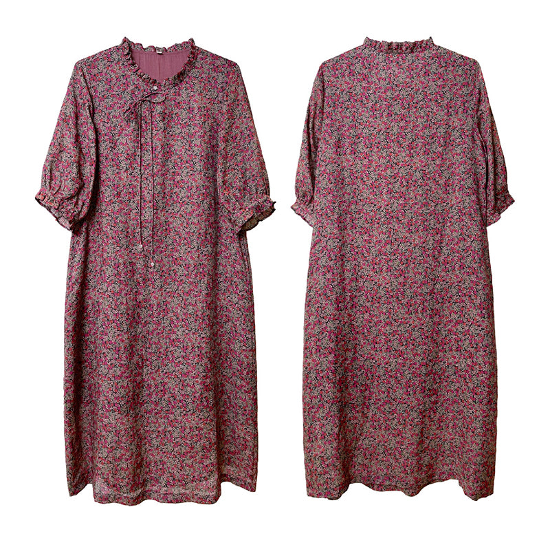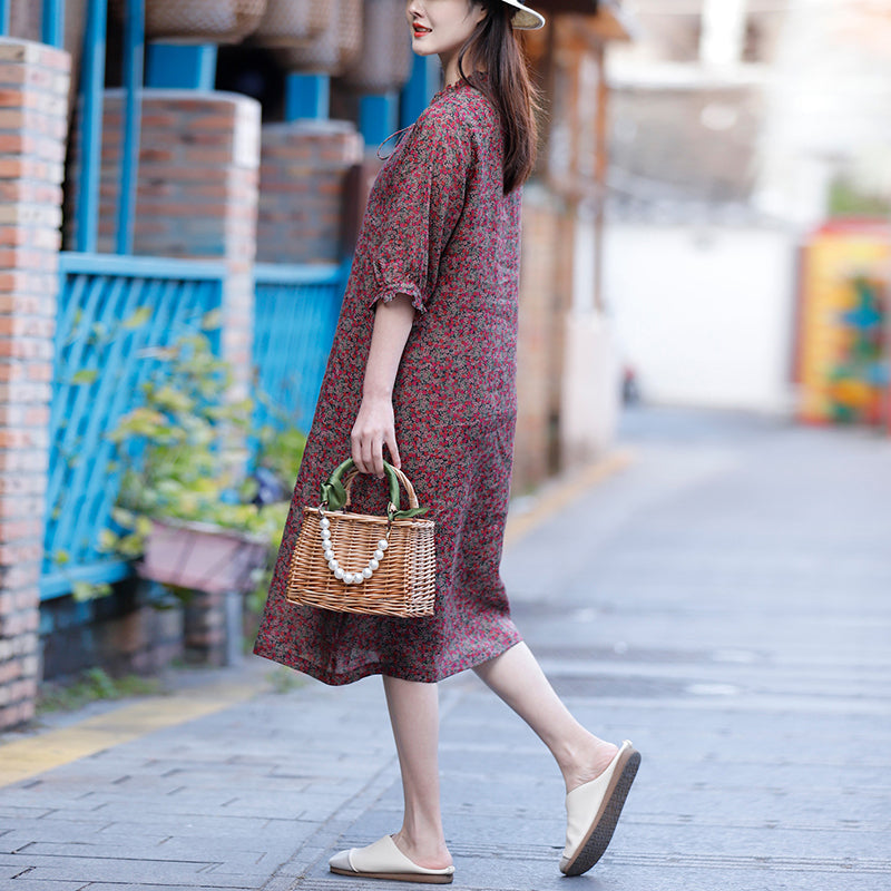 Đầm liền linen ngắn tay cổ tròn xếp ly in hoa liti - NU8275