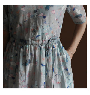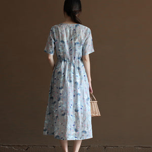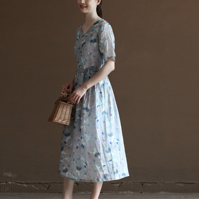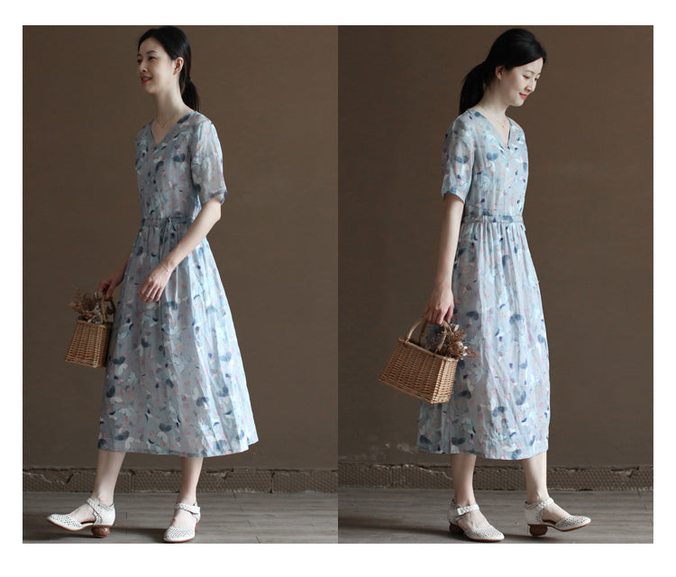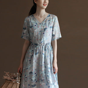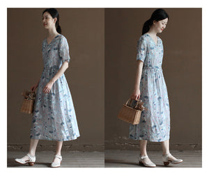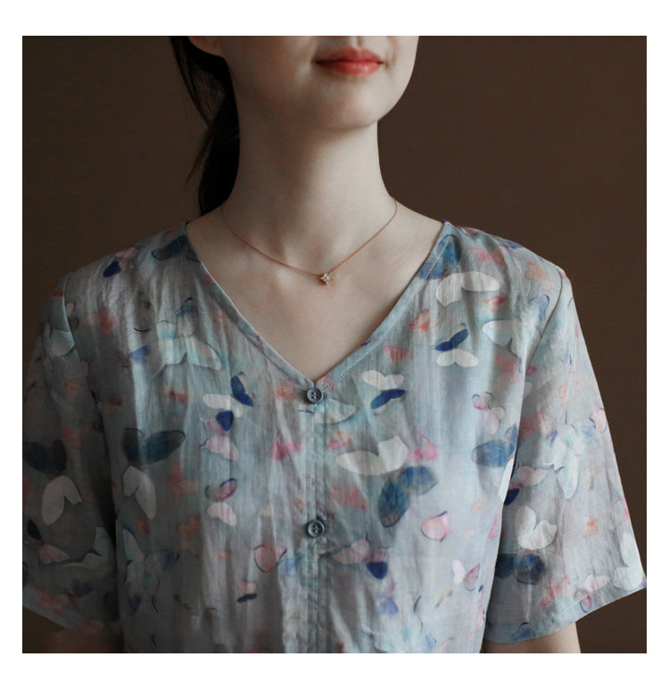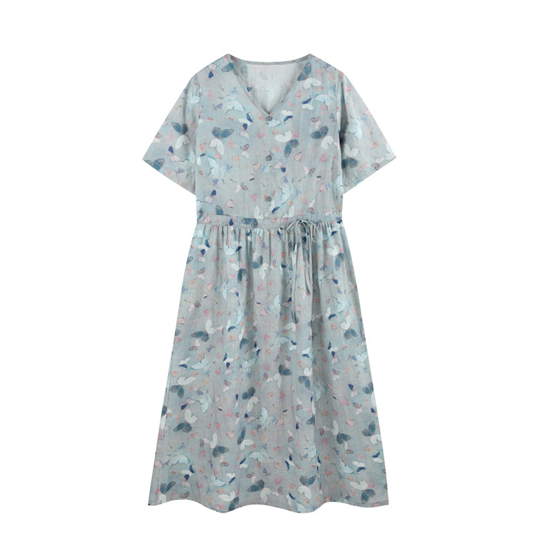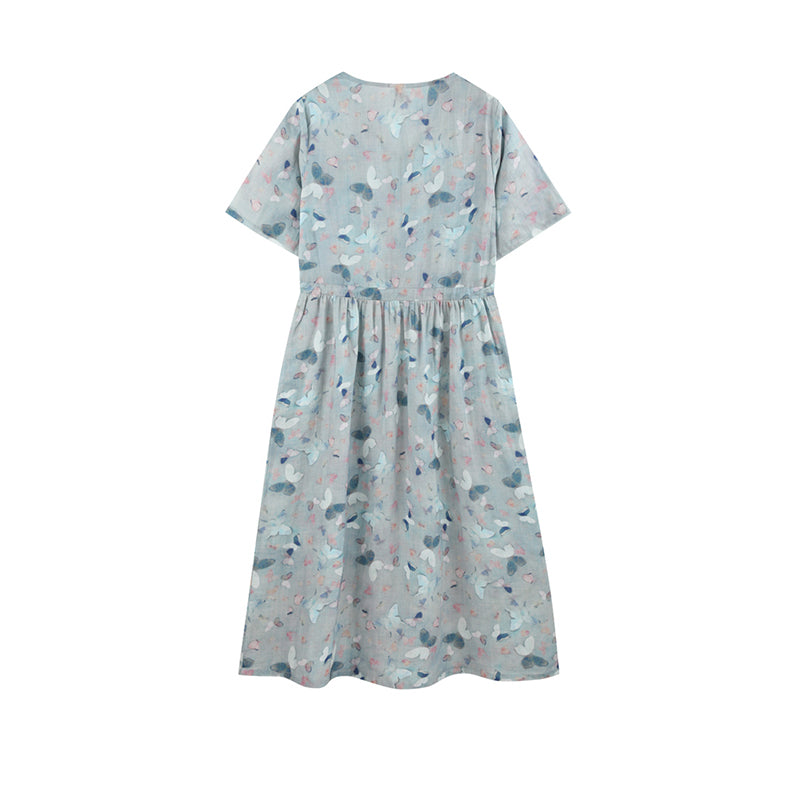 Đầm liền linen ngắn tay cổ V in những cánh bướm - NU10020