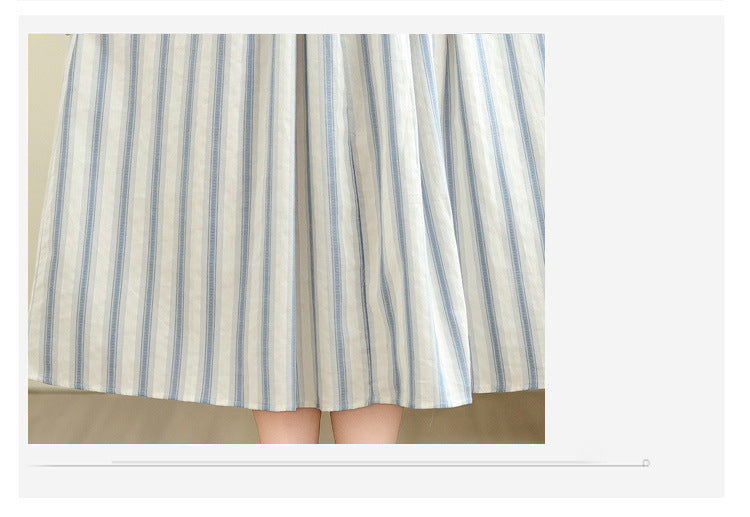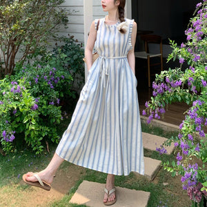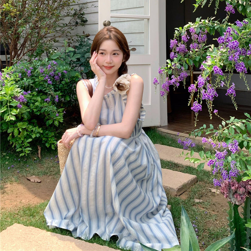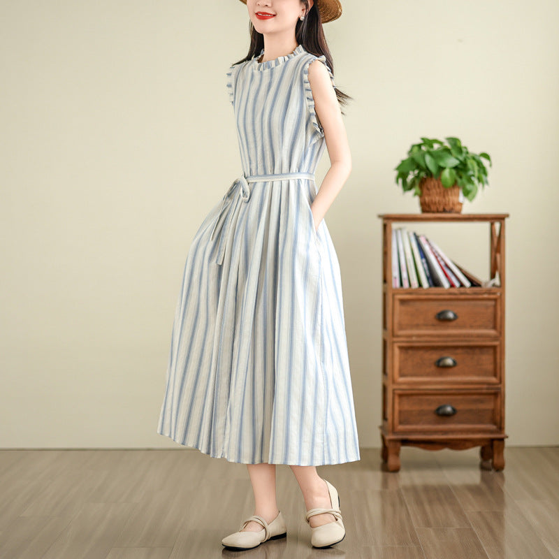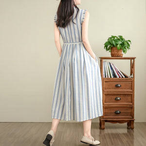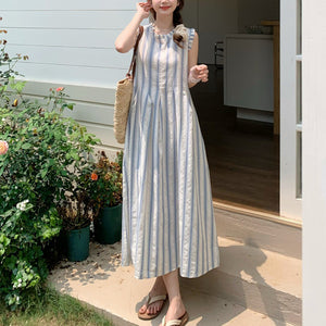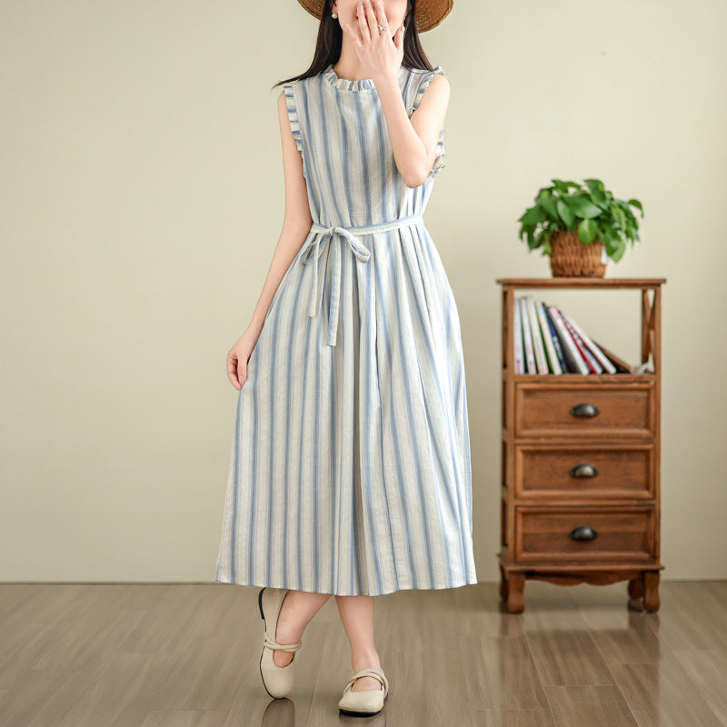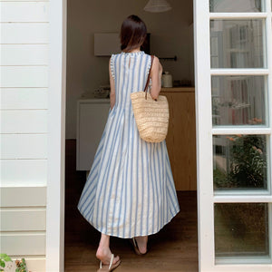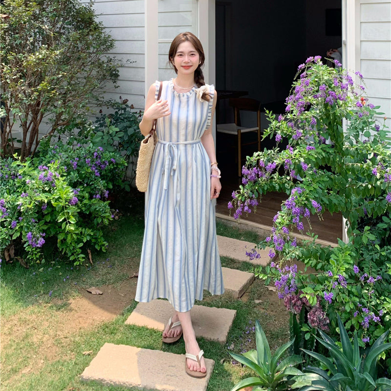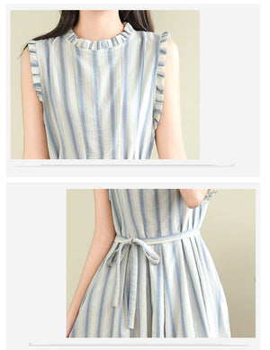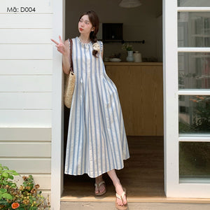 Đầm liền sát nách cổ tròn xếp ly kẻ sọc - D004