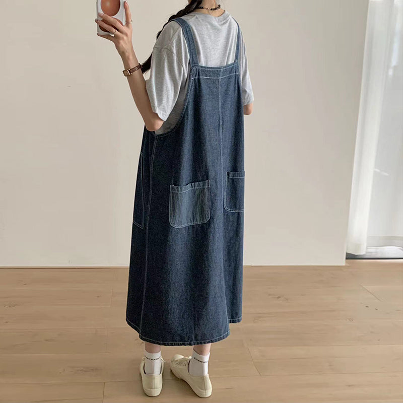 Đầm yếm denim túi lớn lệch màu có khuy cài - NU10358