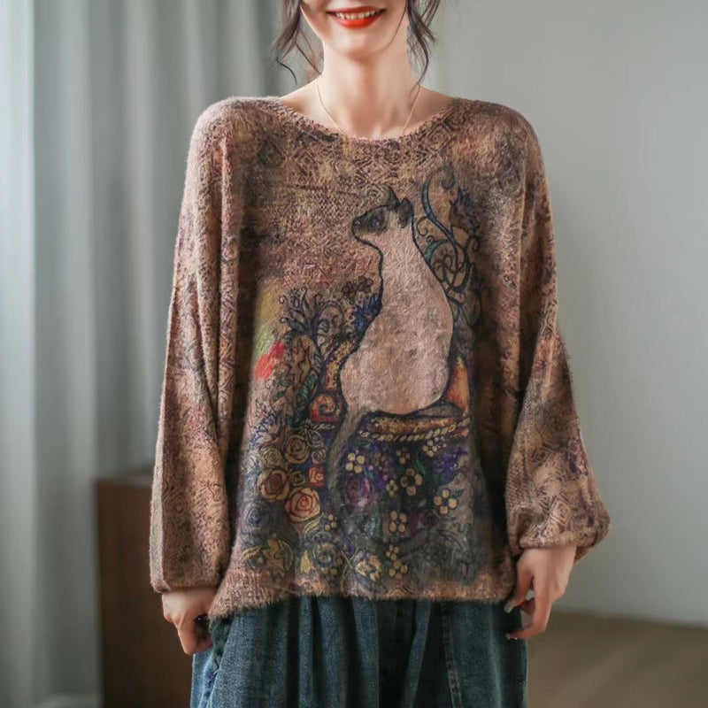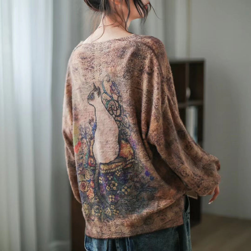 Áo len cashmere dài tay vườn hoa và chú mèo - NU7731